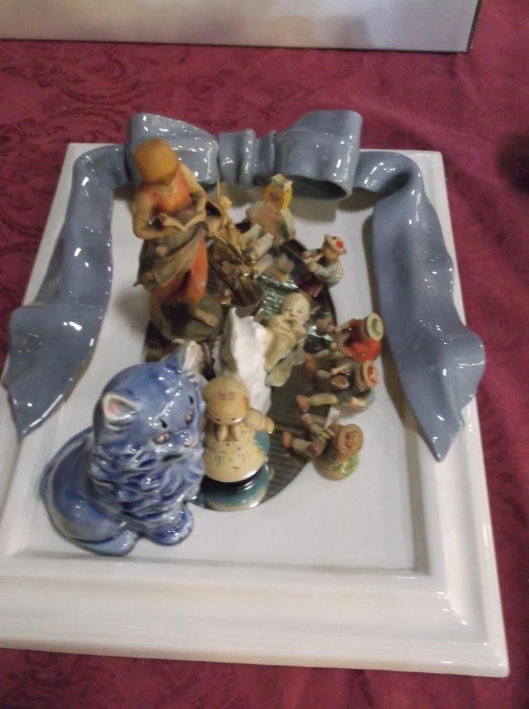we placed all figurines on mirror --- the mirror has a blue ribbon on white porcelain nice for a child's room, we have 4 wooden possible figurines, 1- blue porcelain cat, 1- wooden figurine of a women reading,