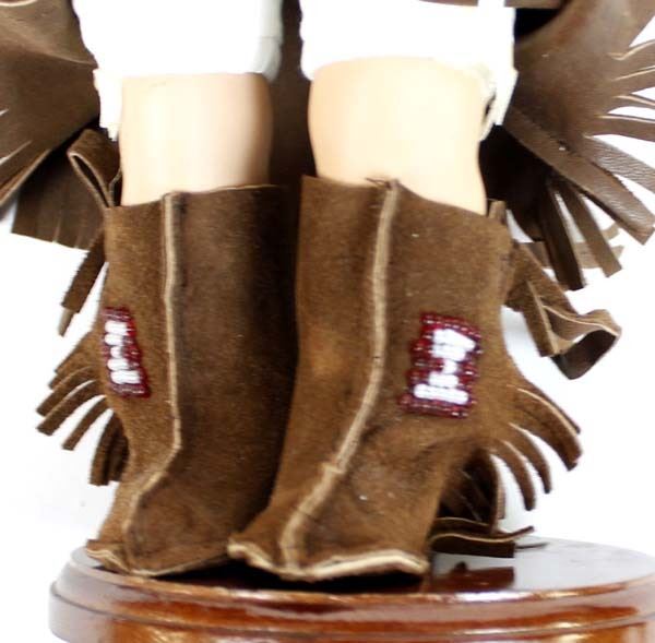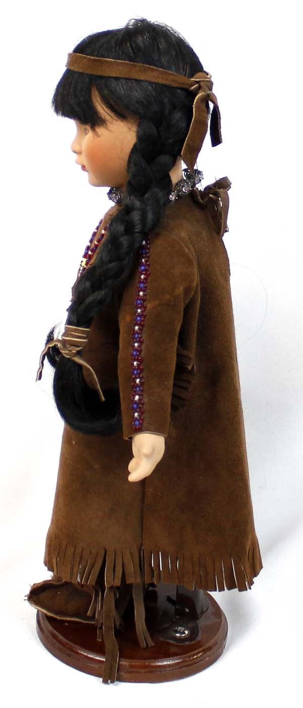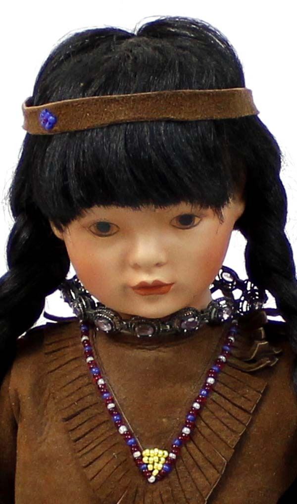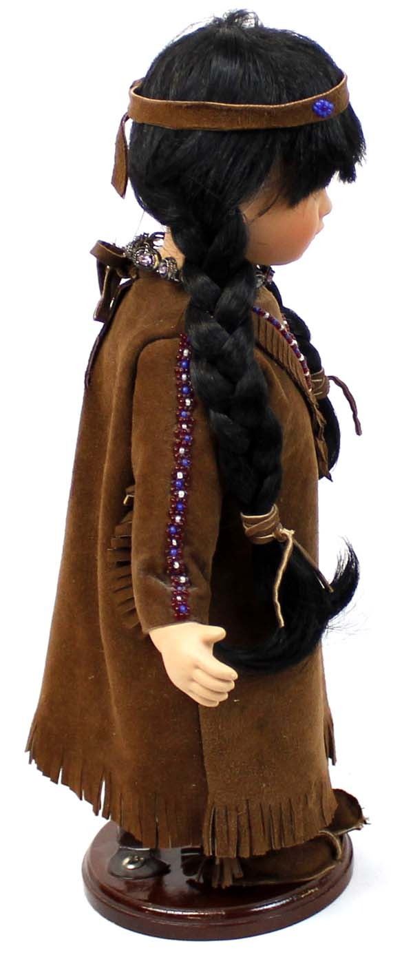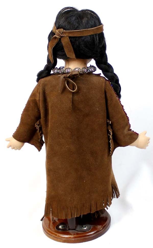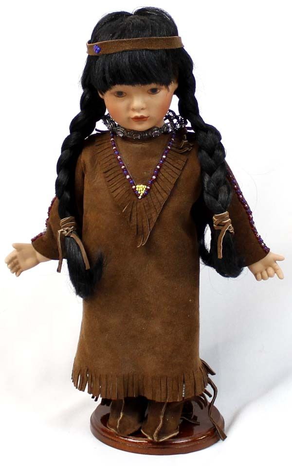 Porcelain Native American Style Doll, measures 14''H, beadwork on dress, comes with stand, around her neck is a vintage sterling amethyst link bracelet