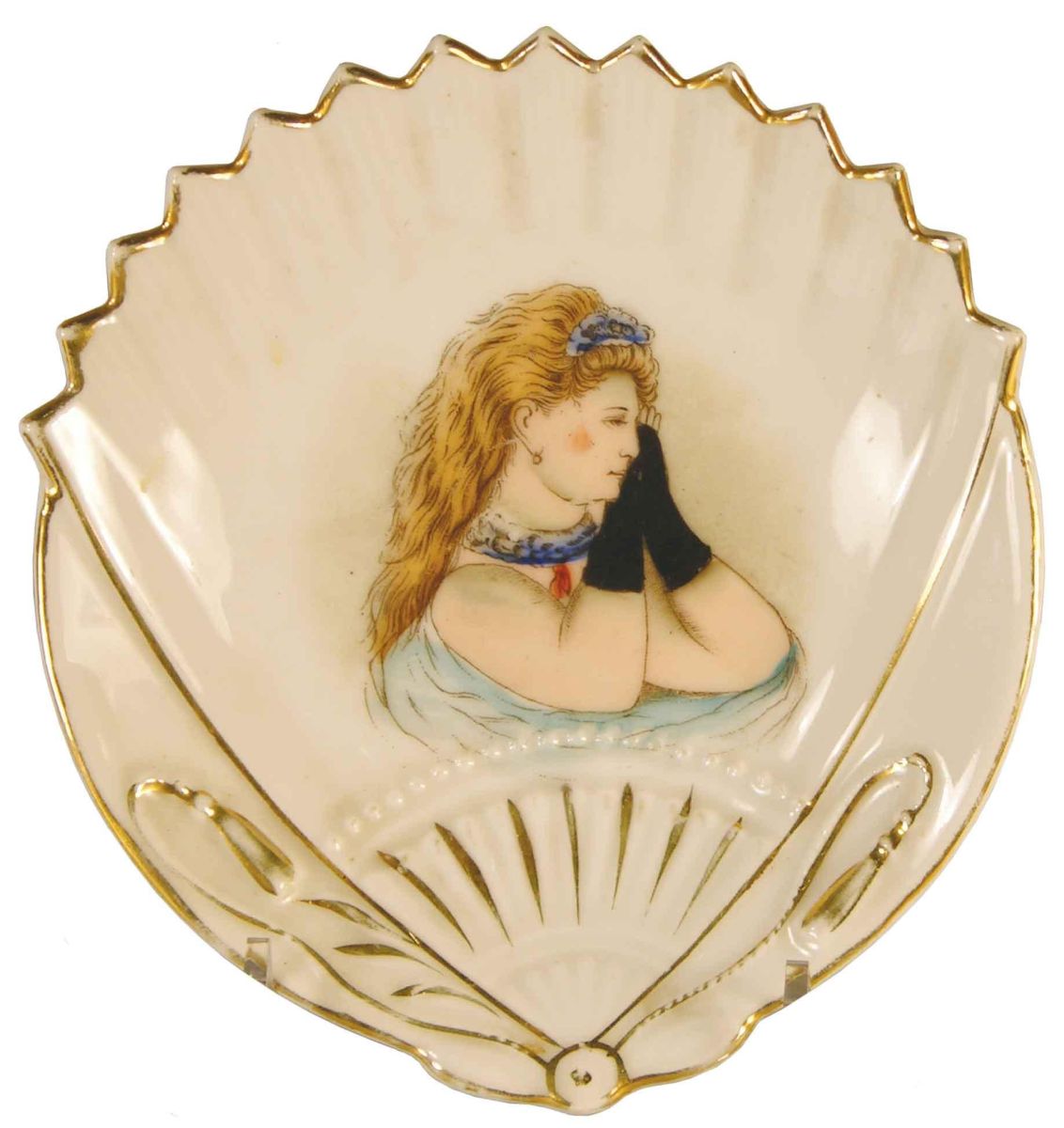 Porcelain Naughty Plate, Sea Shell shaped. Cover head with thumb to reveal risqué image. No chips or cracks, excellent condition 5 inch diameter.