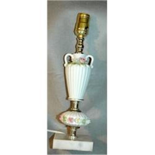 Lovely porcelain lamp in nice condition. It has a marble base. It is 13" tall. <p> The lamp works just fine and the cord looks good too. <p> It is rare to find these lamps in such fine shape. Usually the flower pedals are broken off. However this one here is in A1 condition. There are no broken or chiped flowers or edges. There are a few inconsistencies in the glaze but that has to do with the manufacturing process and not damage. <p> It comes without a shade. The type of shade it will need is the old type that clips onto the lightbulb. <P>