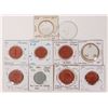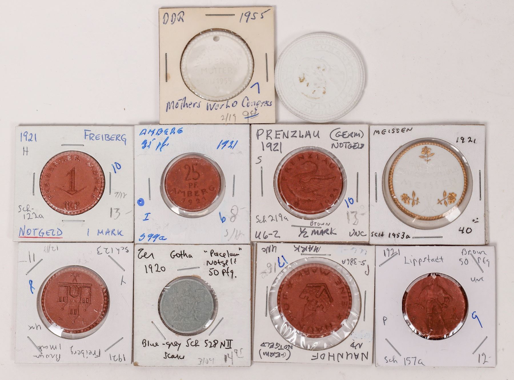 Ten pieces of ceramic "notgeld" coinage from various German towns. Brown, white, grey and the piece from Meissen is white with gold accents. Meissen is famous for the manufacture of porcelain, based on extensive local deposits of china clay (kaolin) and potter's clay (potter's earth). The notgeld coins were issued for the province Saxony in the cities Meissen and Freiberg, the state of Thuringia in the city of Eisenach, in Silesia in the city of Münsterberg and in Saxony-Anhalt in the city of Quedlinburg.
