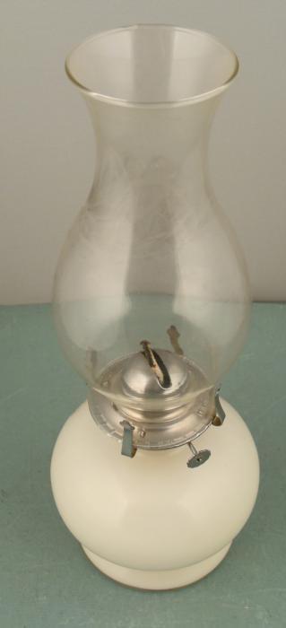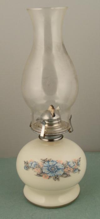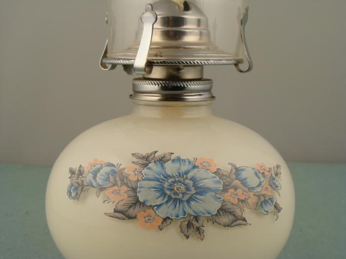 This oil lamp is porcelain with transfer pattern in blue, pink and green floral. It measures 5 1/2" in diameter, and 14 1/2" tall with the glass shade. It is in excellent condition, with no chips, and has seen only minimal use. The thumb wheel is marked "Lamplight Farms."