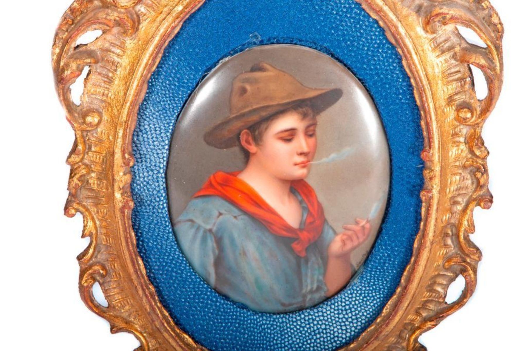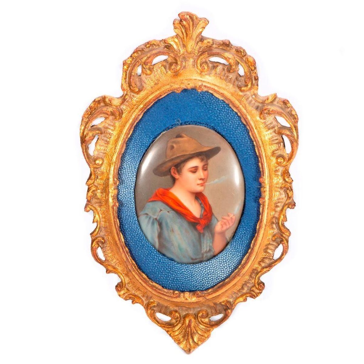 Oval Portrait Plaque in a carved wooden gold frame. Signed. Overall H-11.5" W-7.25" Plaque - H-4.5", W-3.25" Condition, Very Good.