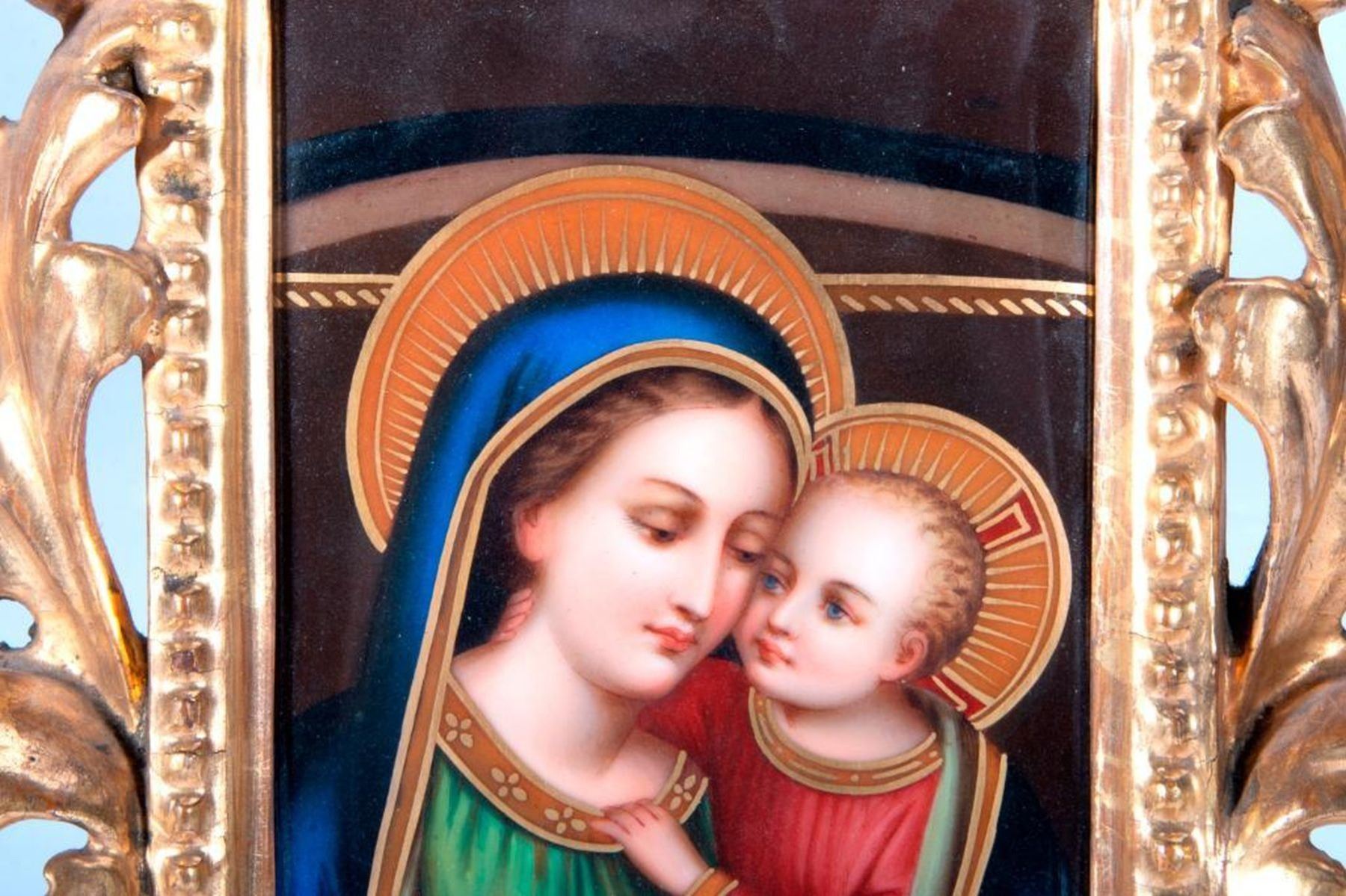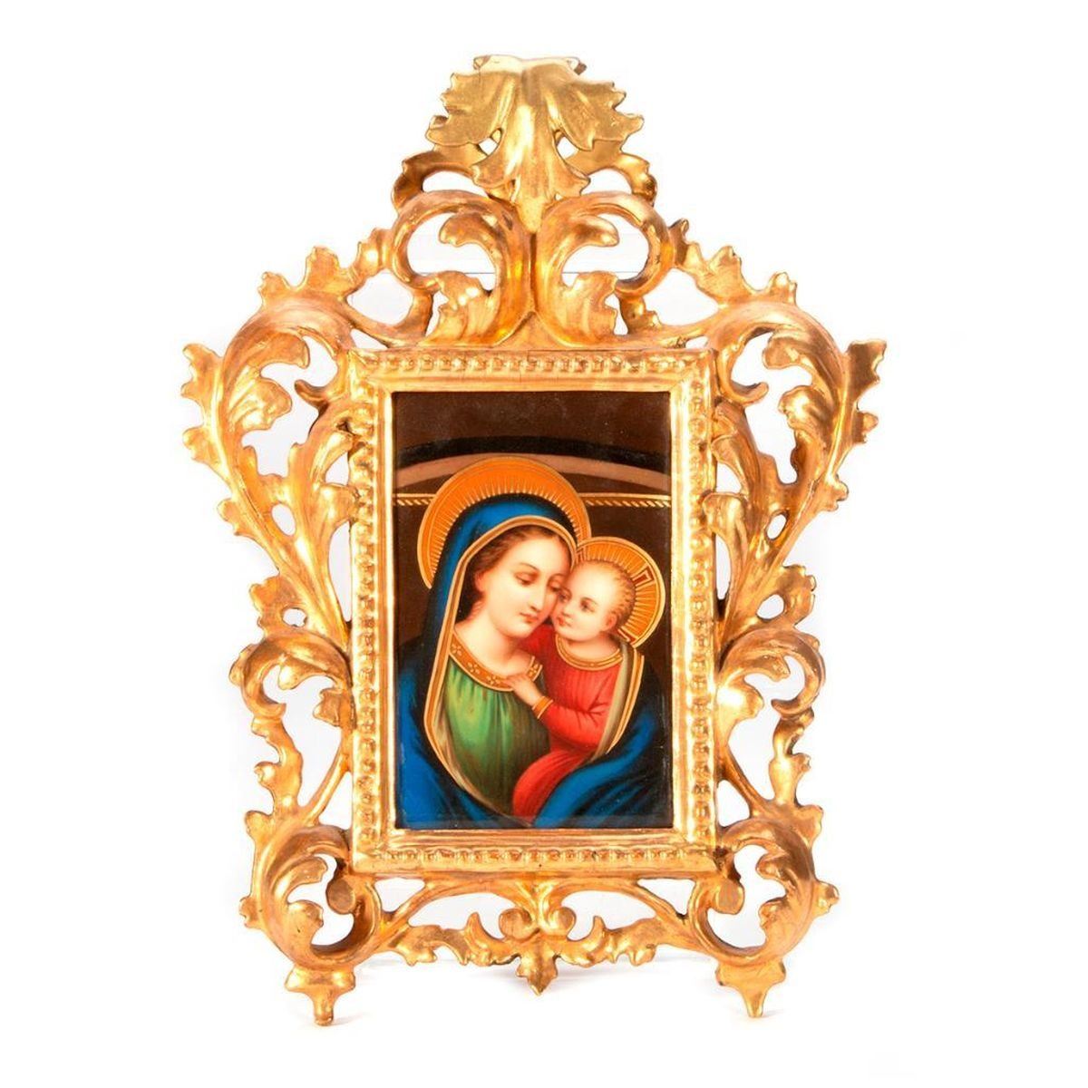 Rectangular Porcelain Plaque of Madonna and Child in a gilt wooden frame. Overall-H-12.25", W-9.5" Plaque-H-6.5", W-4.25" Condition: Excellent, not examined out of the frame.
