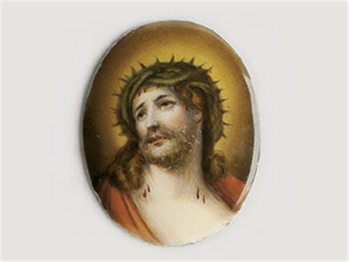 Big oval porcelain, painted Jesus Christ, gross weight: 13.4 g, chipped.