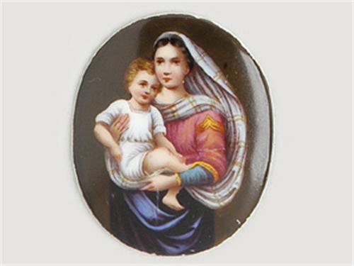 Big oval porcelain, painted Virgin Mary with the Child, gross weight: 21.0 g, chipped on the backside.