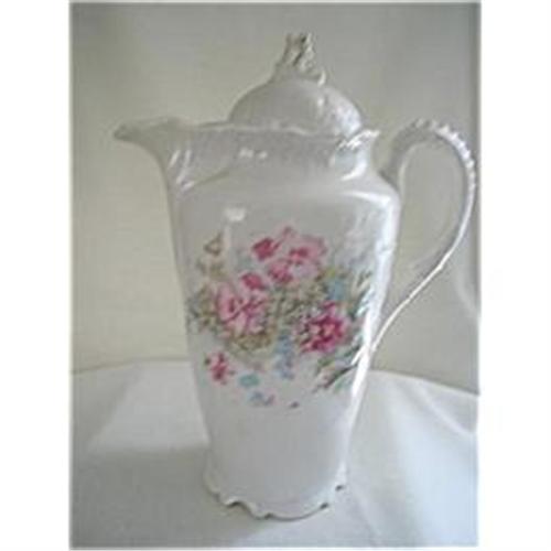This lovely hand painted pink and blue floral chocolate pot has no makers mark only the number 11 impressed in the bottom. The colorful floral arrangement, light pink, dark pink, blue and white with green leaves, on the white background with gold trim really makes this cocoa pot stand out and would be a great addition to any collection. In very good condition, there are 2 small fleabites on the inside rim and the gold trim is fading from age, it measures 9 3/4 inches tall, 3 1/4 inches by 7 inches, spout to handle and 3 1/4 inches across the base.<BR>SH & Ins. will be quoted after orders placed. If you have questions please contact me and thank you for looking.