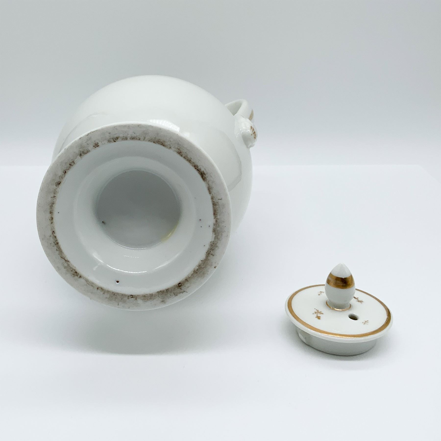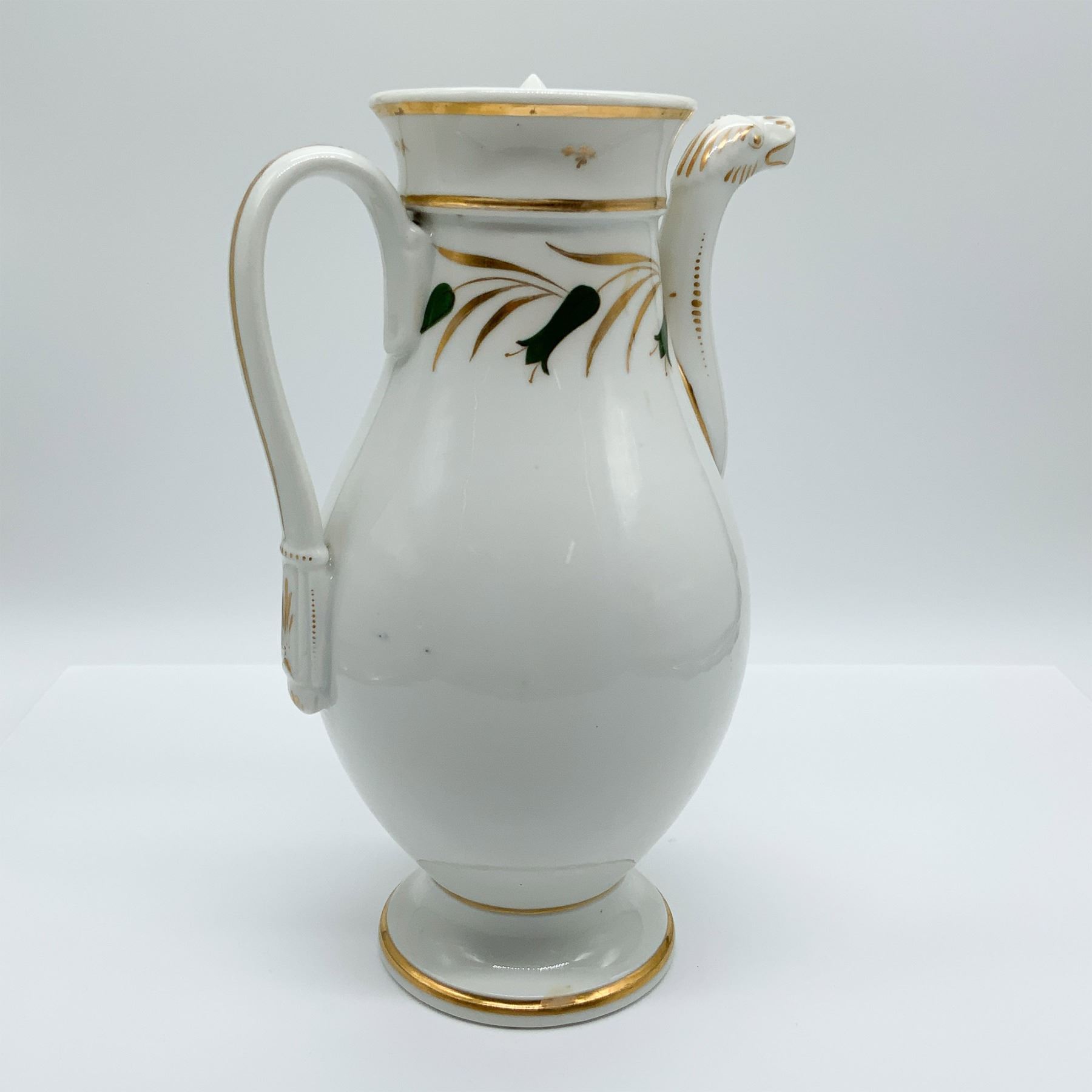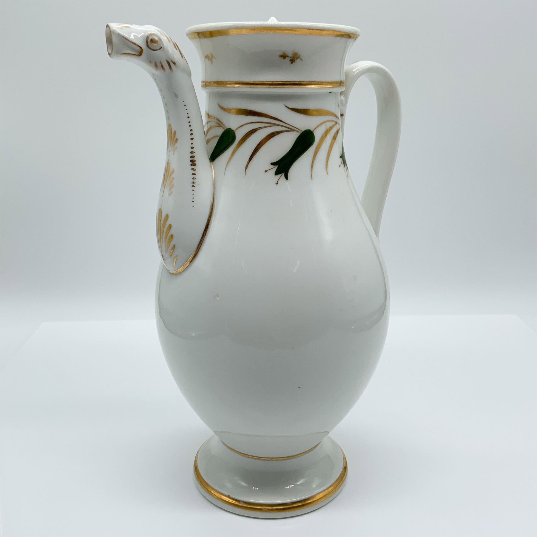 A porcelain pitcher featuring an ornate spout shaped like a bird's head, adorned with handpainted green and gold details. The piece includes a matching lid with a finial handle and pierced holes, likely intended for use as a teapot or coffee pot. The elegant design is highlighted by delicate gold accents on the rim, base, and handle.