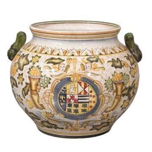New Hand painted porcelain features floral and crest design - Dimensions: 17"h, 19"diam