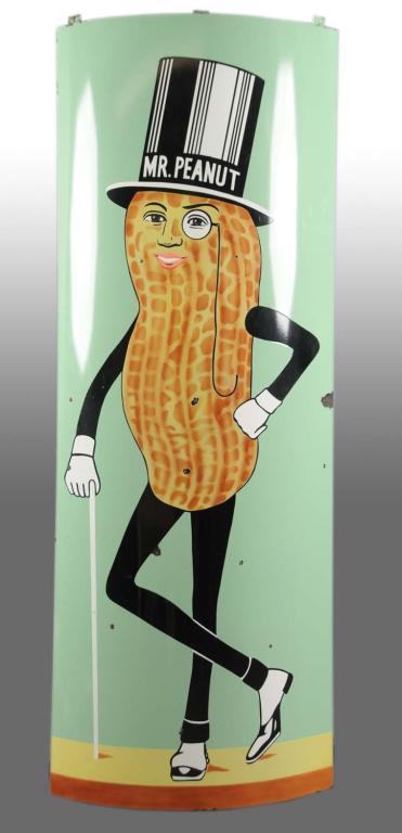 1930s to 1940s. This sign was originally on the Planter’s Store in Memphis, Tennessee. Five color porcelain has great shine and is rounded in a half-moon shape. Porcelain is in great shape with minor chips on front, presumably caused by a gunshot, but no apparent rust on the overall sign. Only known example of this sign. Condition (Excellent). Size 6 - 1/2' x 2 - 1/2'.