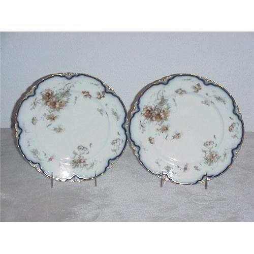 A pair of porcelain plates, 9 5/8" in diameter, made in Limoges France for Haviland & Co. In the "Feu de Four" pattern. Early 20th century, they are decorated with transfer of flowers and edged with a blue and gold rim. The name "Crocker" on the back is a family name, the pair were part of a larger set, the rest were too chipped to include. They are very pretty and hung on a wall or displayed in a cabinet they will be lovely. Condition is very good, one has a small chip on the back side of the rim. (3)