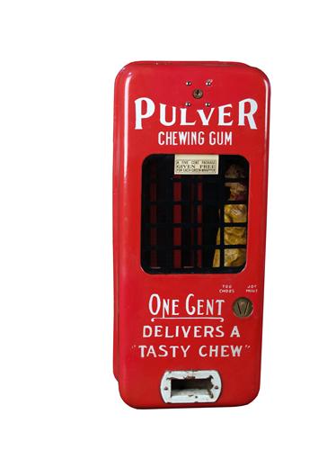 Porcelain Red Pulver Wall Mount Gum Machine Paper Mache Yellow Kid. Yellow Kid is distorted. Very few chips in porcelain. Works OK w/keys