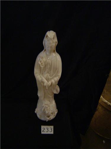 Milk Porcelain Quan Yin Figurine, 16" tall X 4" wide X 4" deep. Quan Yin hold a Lotus Flower while she pours out compassion from the bottle. Three dragons surround her feet. Small flaw in glaze on back side of piece. Beautiful white figurine. From China.