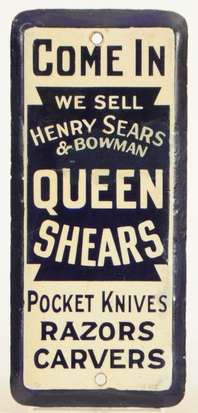 Porcelain Queen Shears Door Push Advertising, Measures 9" x 4" Shows restoration.