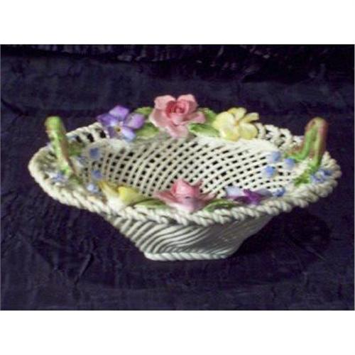 </font></strong>Beautiful intricate porcelain basket dish by Golden Crown of England. High quality and the details of the flowers are exquisite. The bottom has a basketweave pattern while the rest is an open weave. This has two handles on either end with life like flowers in pink, yellow, purple, and blue. The bottom is marked: Golden Crown, E&R, England, Fine Bone China. The dish measures 6" by 6 3/4" and stands 3 1/8" tall. This looks to be in excellent condition. I could find no chipping to the flowers at all. Very pretty piece!</font>