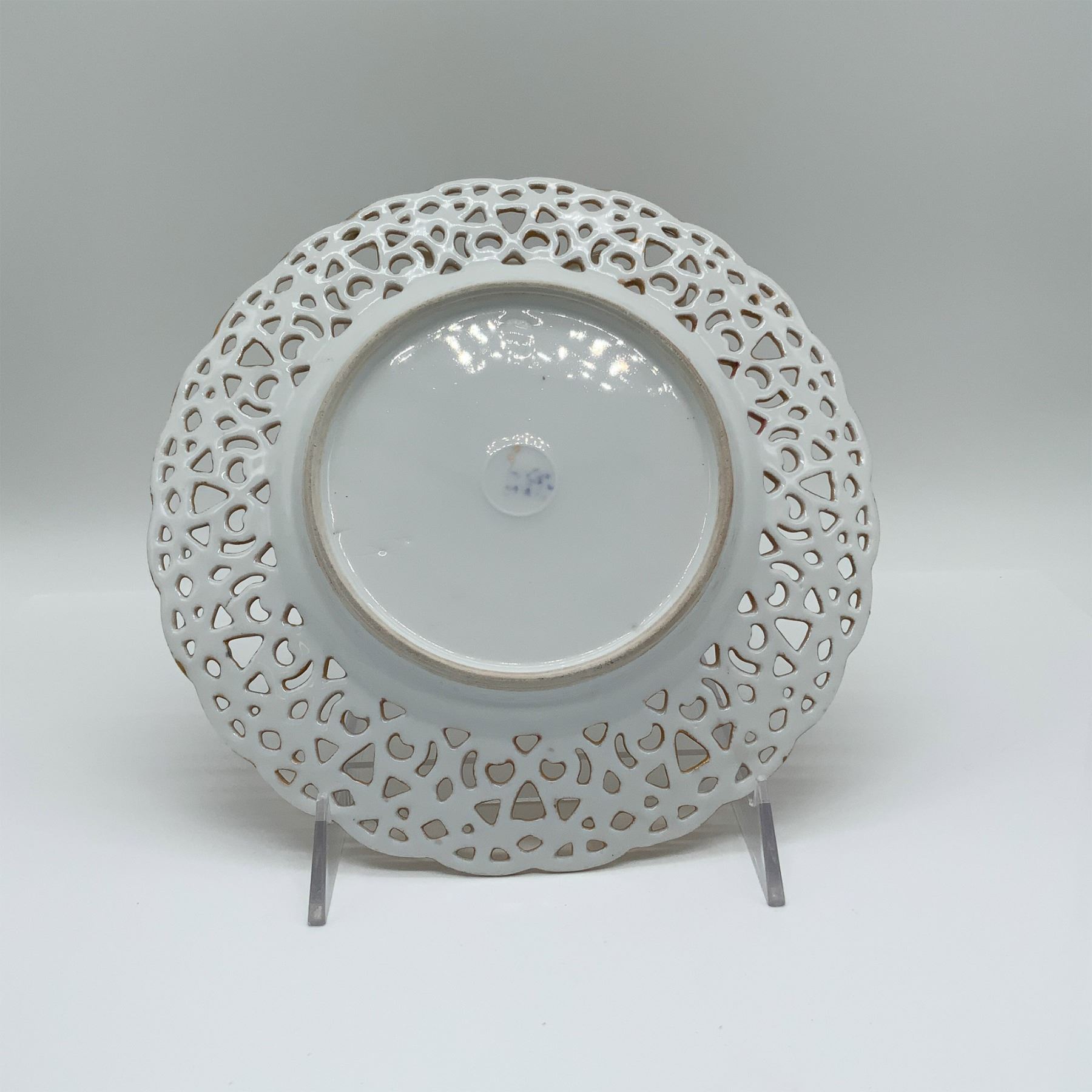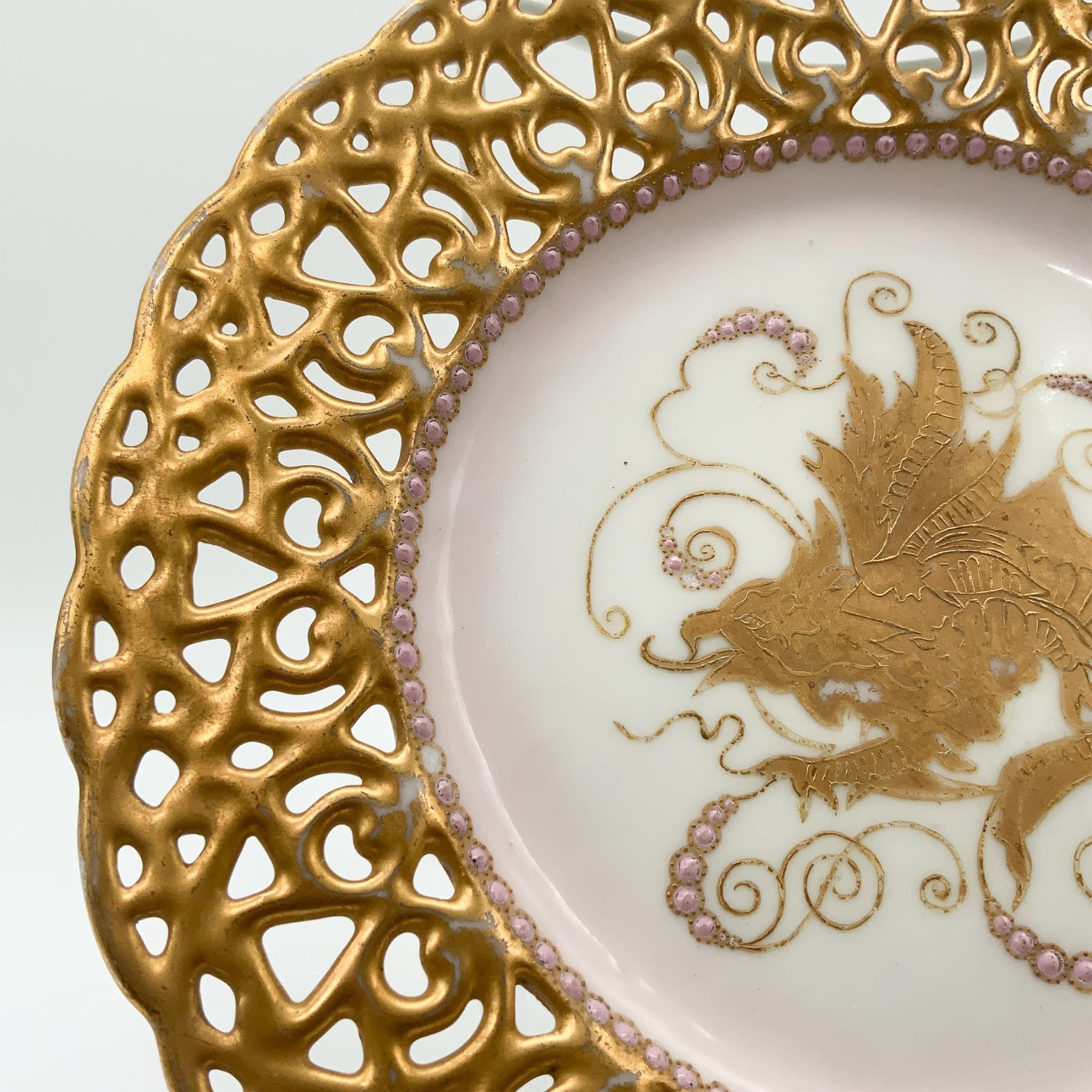 A finely crafted porcelain plate featuring an intricate reticulated rim finished in gold. The center displays an elaborate gilded dragon motif surrounded by pink bead accents. The design showcases exquisite detail, with delicate patterns and vivid gold embellishments adding a touch of elegance. Measuring 8.75 inches in diameter, this decorative plate is both a captivating art piece and a reflection of fine porcelain craftsmanship. The underside bears a blue hallmark, confirming its origin. Ideal for collectors of ornate porcelain or as a statement display piece.