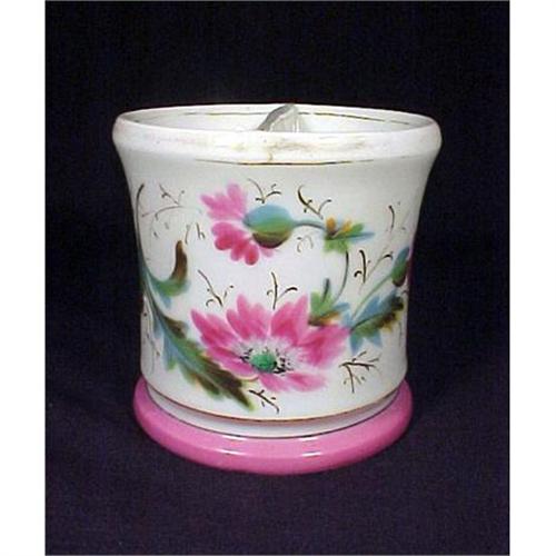 This is a very decorative and artistically done shaving mug. The mug has vivid pink flowers flowing along the side with green, blue, and brown leaves embracing them. The work looks more like an impressionist painting then a decoration for a shaving mug! There is also a matching pink band at the base with gold enameling not only on the rim and above the base but wisped throughout the flowers and leaves. There is quite a bit of wear to the gold enameling due to age and use but other then that it is in excellent condition. It measures 3 3/8?h with the opening 3 ½? in diameter.