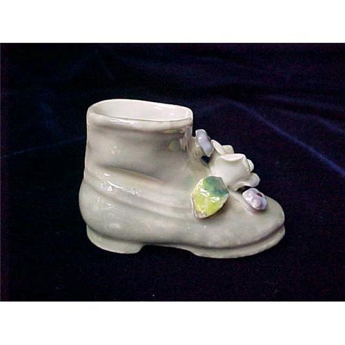 Porcelain Shoe. 1 ¾? tall, 2 ½? long. Adorable little shoe excellent for any decorative space at home, especially small living rooms or foyers. Pleasant dull moss green porcelain with a decorative white flower in the middle. In good condition, still maintaining sheen when presented under a light. Made in Japan. Year unknown
