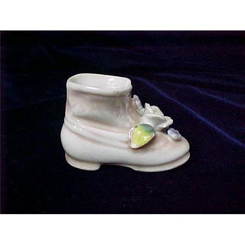 Porcelain Shoe. 1 ¾? tall, 2 ½? long. Adorable little shoe excellent for any decorative space at home, especially small living rooms or foyers, and goes perfectly with its similar partner in crime. Pleasant dull tan porcelain with a decorative white flower in the middle, though not as large as on its brother?s center. In good condition, still maintaining sheen when presented under a light. Says ?Japan? on the bottom. Year unknown.