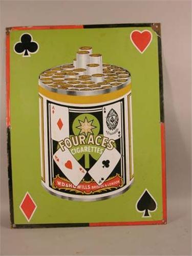 Porcelain sign for Four Aces Cigarettes. 5 color, one sided. 17" x 22" come chips around both top corners.