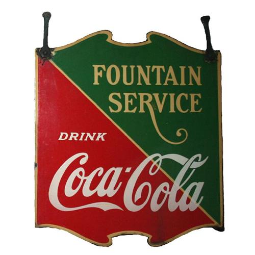 Double-sided, hanging porcelain sign advertises Fountain Service for Coca Cola. On bottom left: Made in U.S.A. 1933.  On bottom right: Tenn. Enamel Mfg. Nashville. Sign measures approx. 23" x 26". Graphics are bright. One side has a small pock mark in area of first C in Coca.  Other side has some paint stains to bottom right.  Both sides have some damage to edge, especially in area where hangers have been attached to sign.  Overall a very attractive piece.