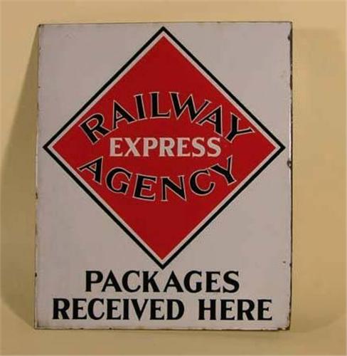 Porcelain sign for "Railway Express Agency." Two sided/flange, Three color. 15"x8". Ex. cond.