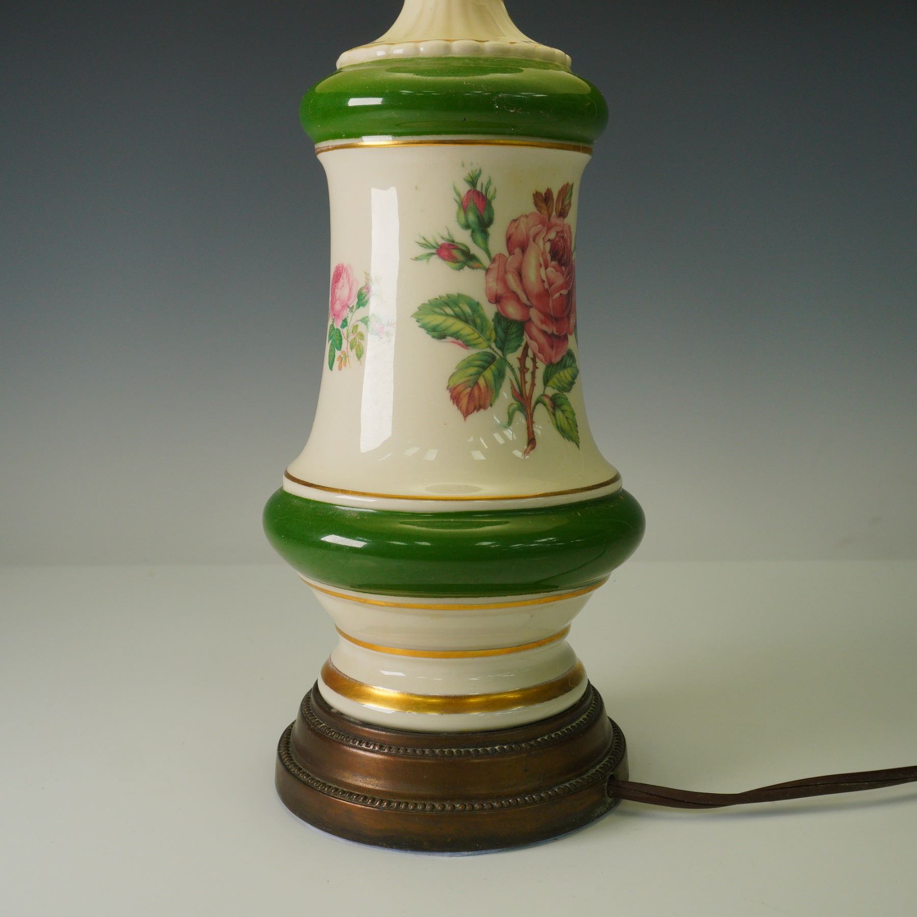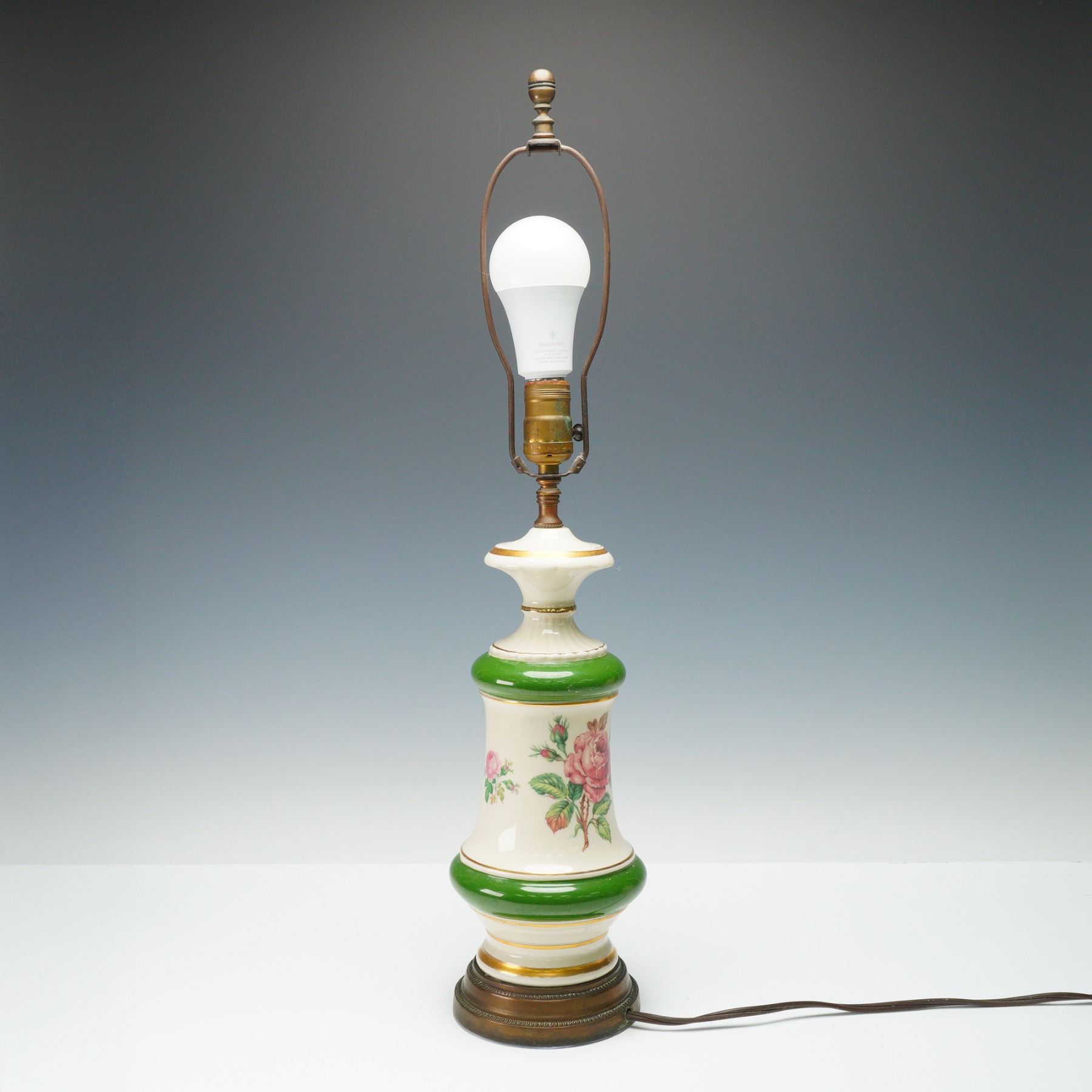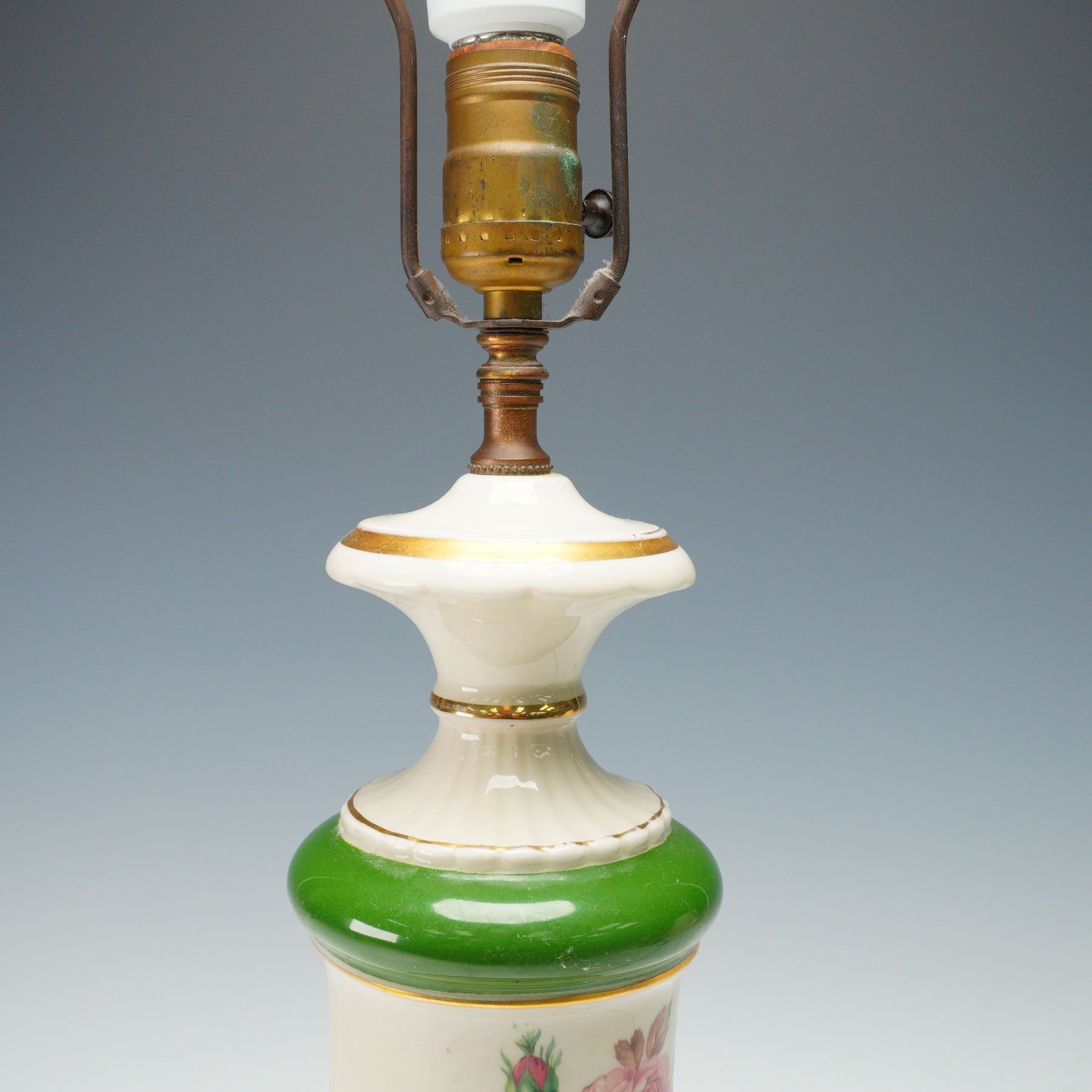 Vintage electric table lamp featuring a porcelain body with hand-applied floral transfers in red and pink, accented by vivid green bands and gilt highlights. Single socket with lightbulb included. Lampshade not included.