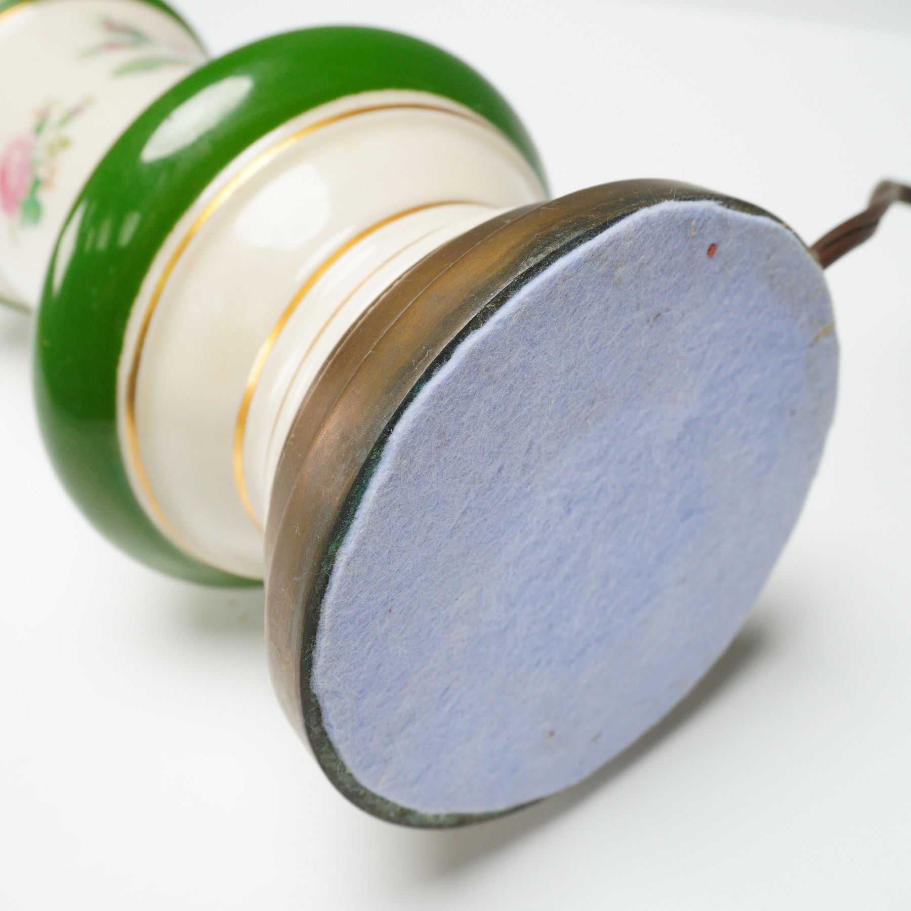 Vintage electric table lamp featuring a porcelain body with hand-applied floral transfers in red and pink, accented by vivid green bands and gilt highlights. Single socket with lightbulb included. Lampshade not included.