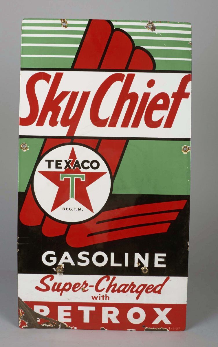 Advertising States; Texaco Sky Chief Gasoline Super-Charged with Petrox 3-1-57, some chipping, mostly to lower section, c1957 Condition (Good). Size 12" x 22".