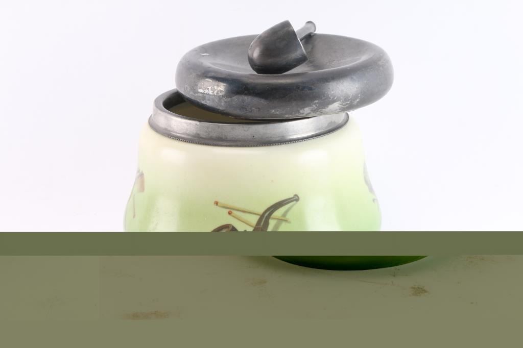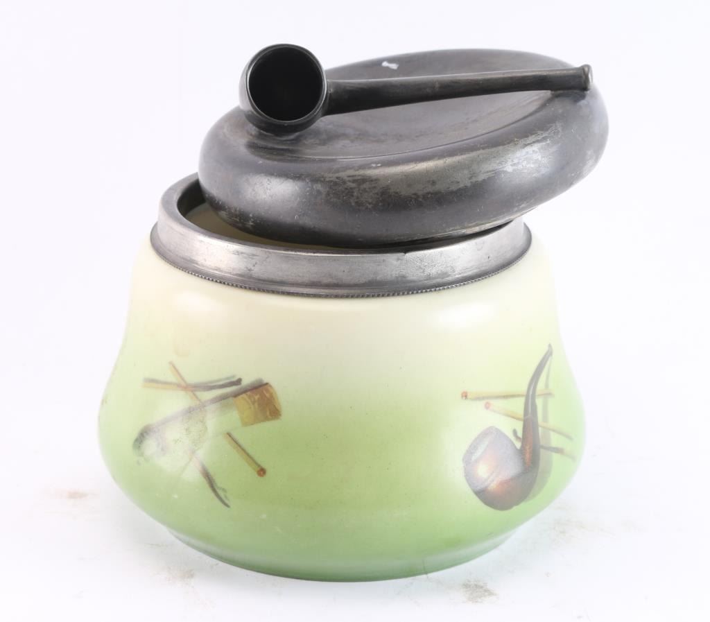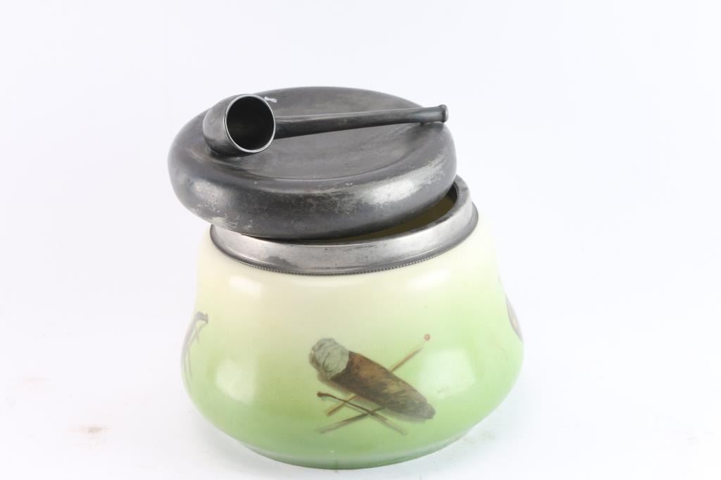 Hand-painted with silver plated top and rim showing applique of pipe. Scenes of pipes, cigars, cigarettes, etc. around body. Approximately 5 1/2" tall. Very good to near fine condition.