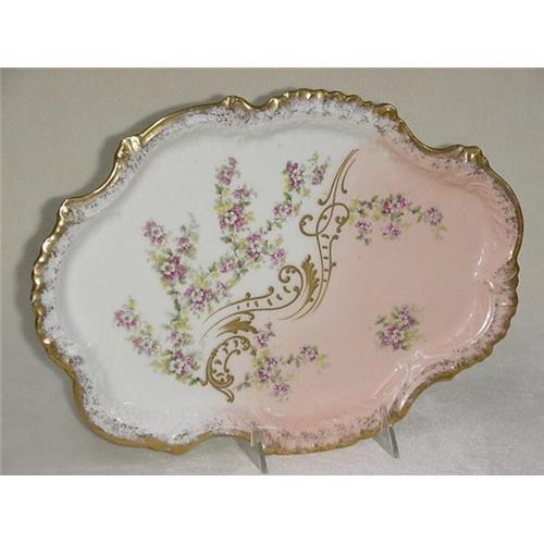 A porcelian tray, 13 1/4'' long, 9 3/4'' wide. Decorated with a transfer design of flowers on two tone surface. Border trimed with gold. Unmarked.