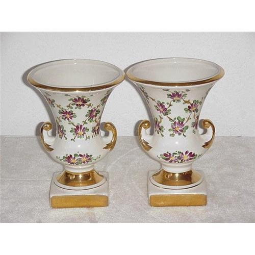 A pair of mid 20th century porcelain urns, 8 1/4" tall, 6" diameter tops, 3 5/8" square base. Hand painted flowers stand out against the white porcelain and the urns are trimmed in gold. No makers mark, the condition is very good, some slight rub marks to the gold but no chips. Very pretty, will look great on a pair of wall shelves.
