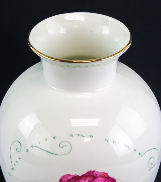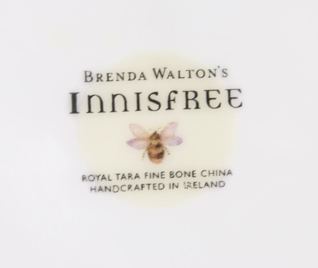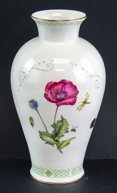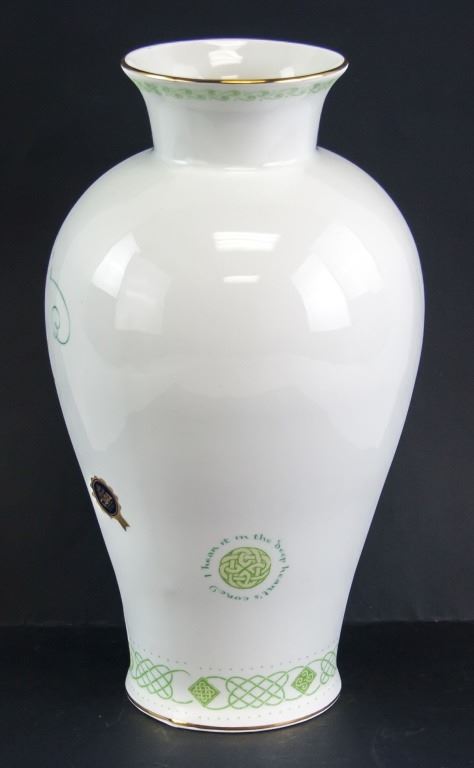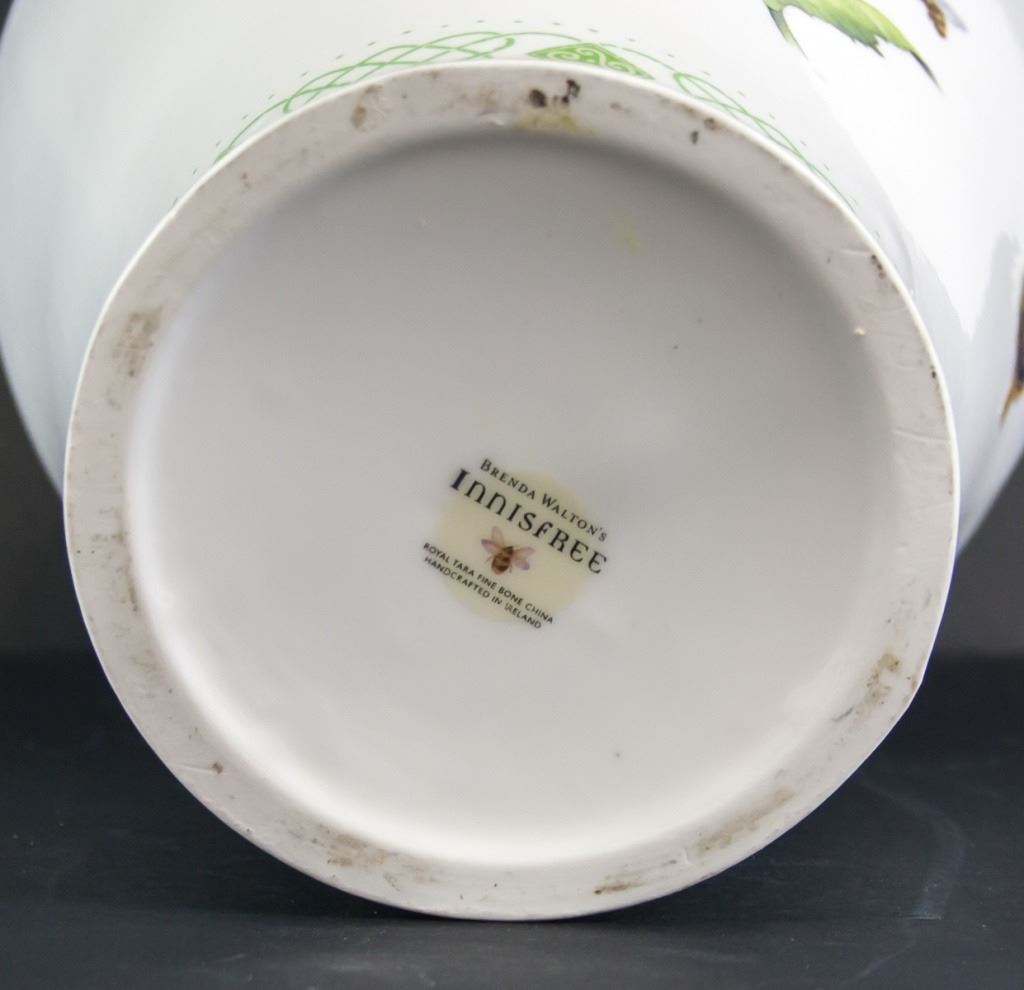 Irish porcelain vase. Of white tone painted with flowers. With wide round opening, short cinched neck, and rounded shoulders tapering to ovoid body, resting on flat base. "Brenda Walton's Innisfree ROYAL TARA FINE BONE CHINA HANDCRAFTED IN IRELAND" stamped on base. 29 x 16 cm. 1,066 grams.