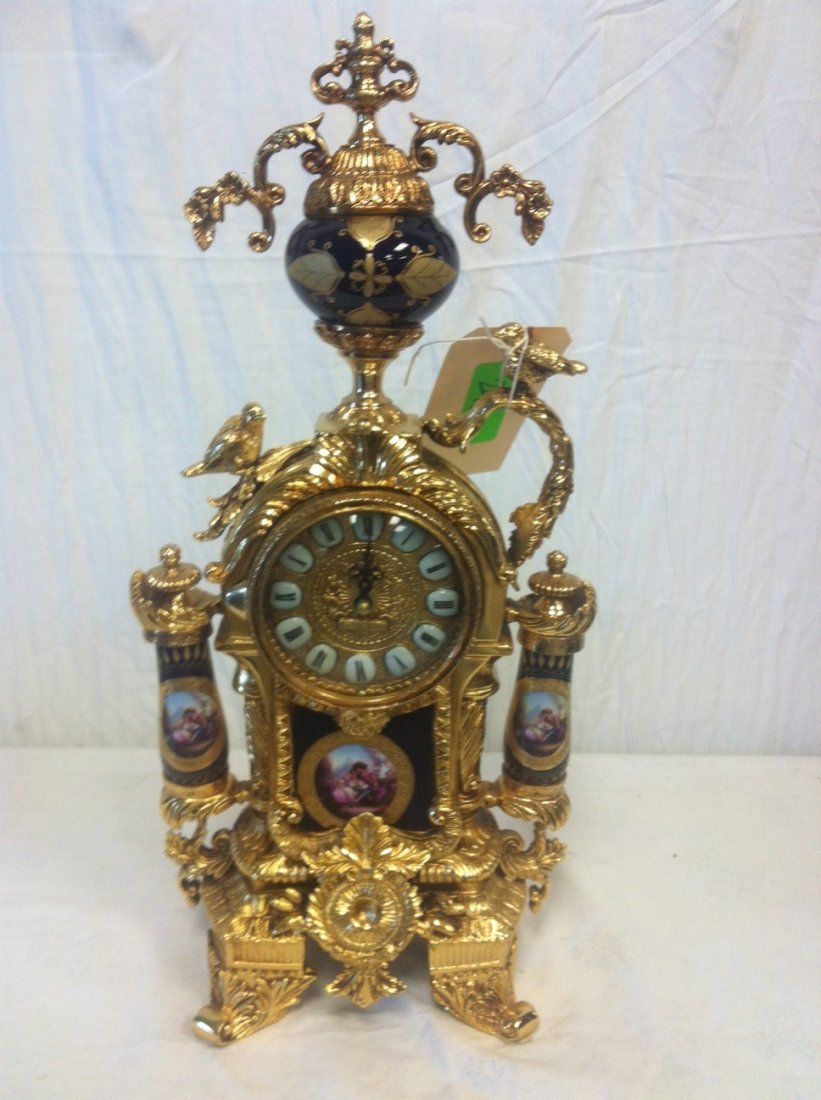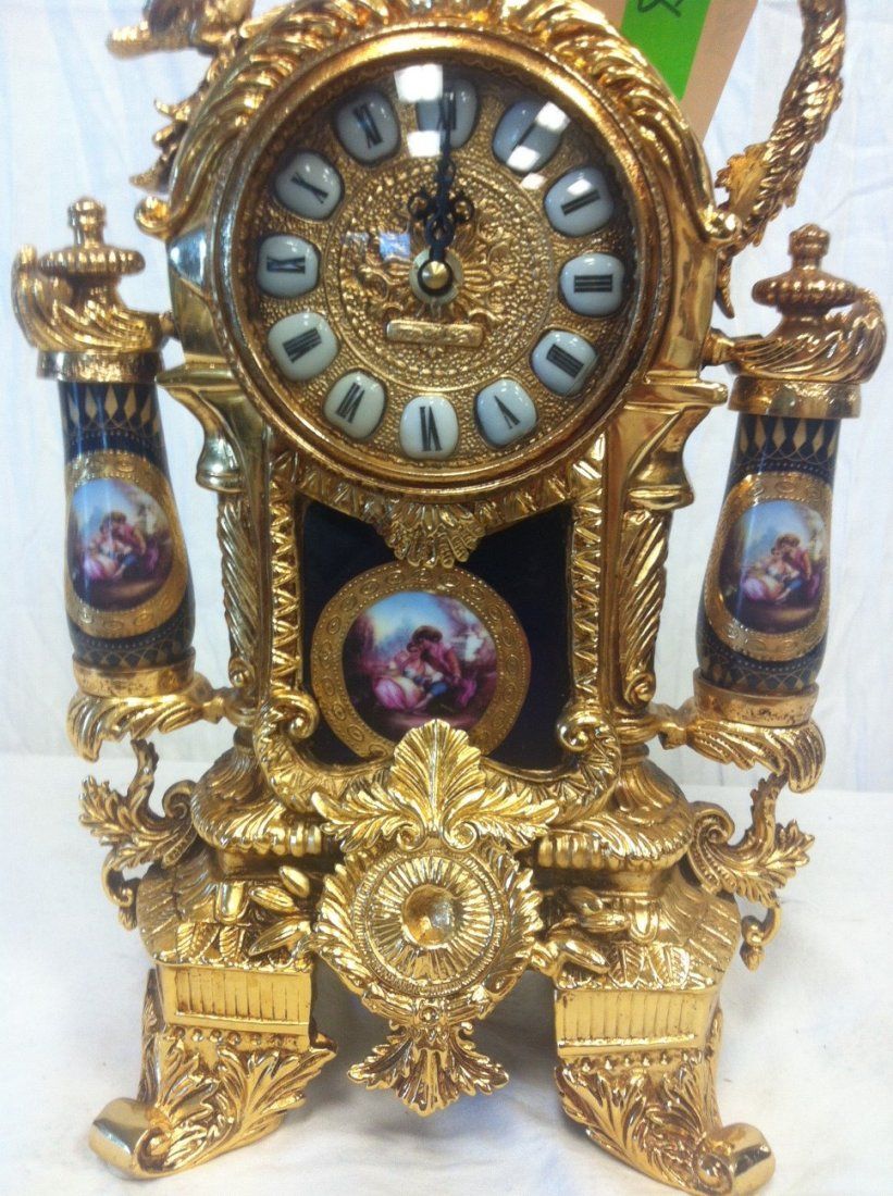 Gold colored ornately crafted brass and porcelain clock. WIth hand painted images depicting a couple in love. 18.5" x 9".