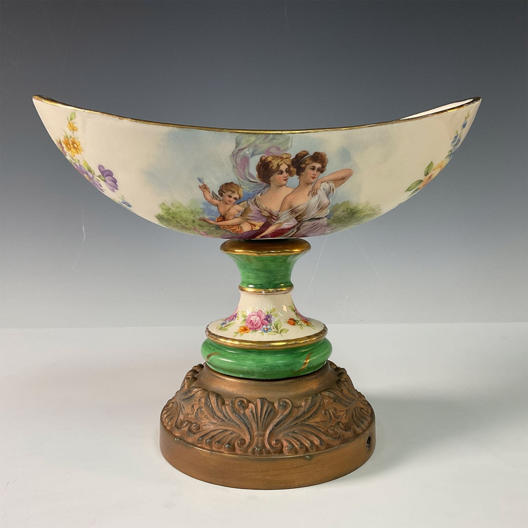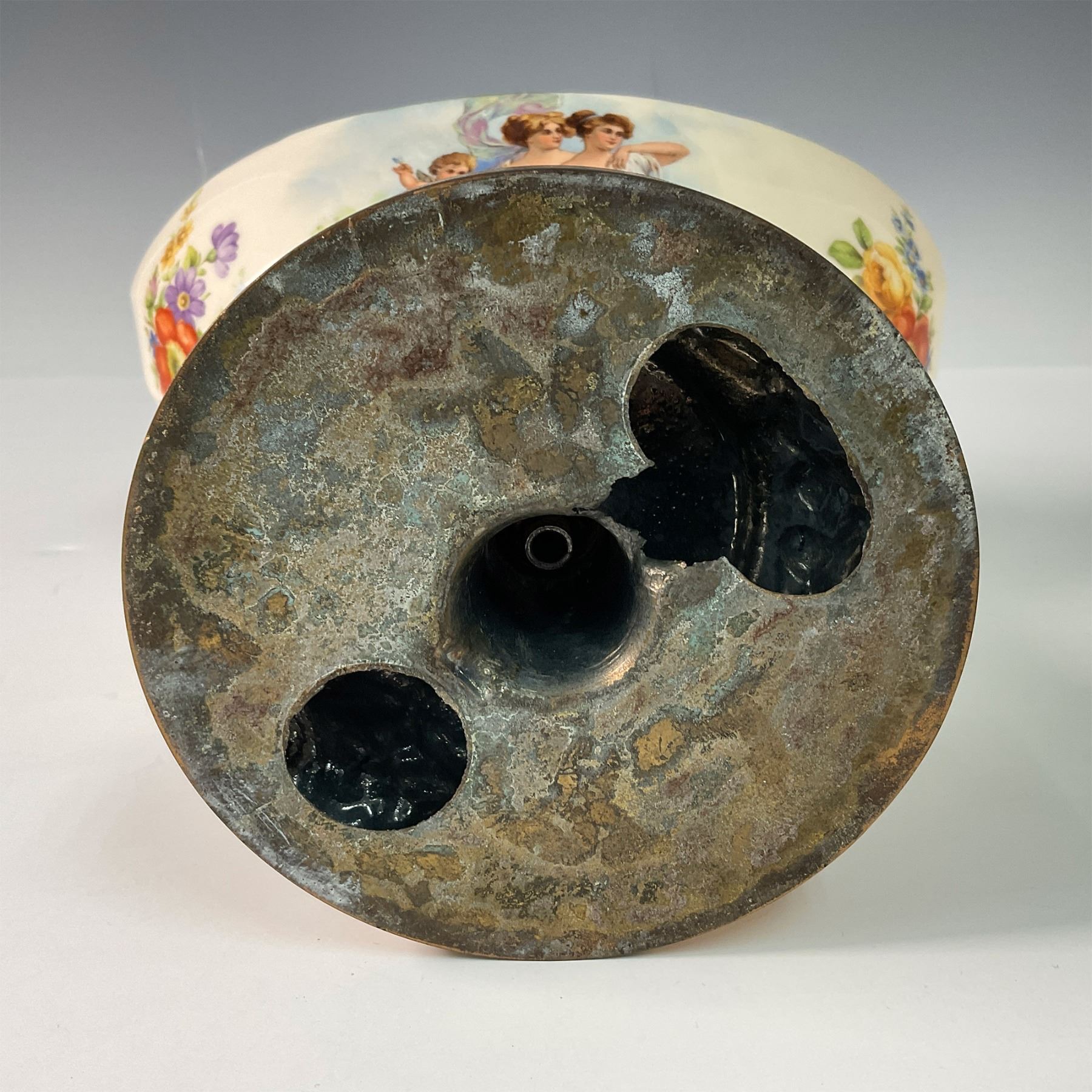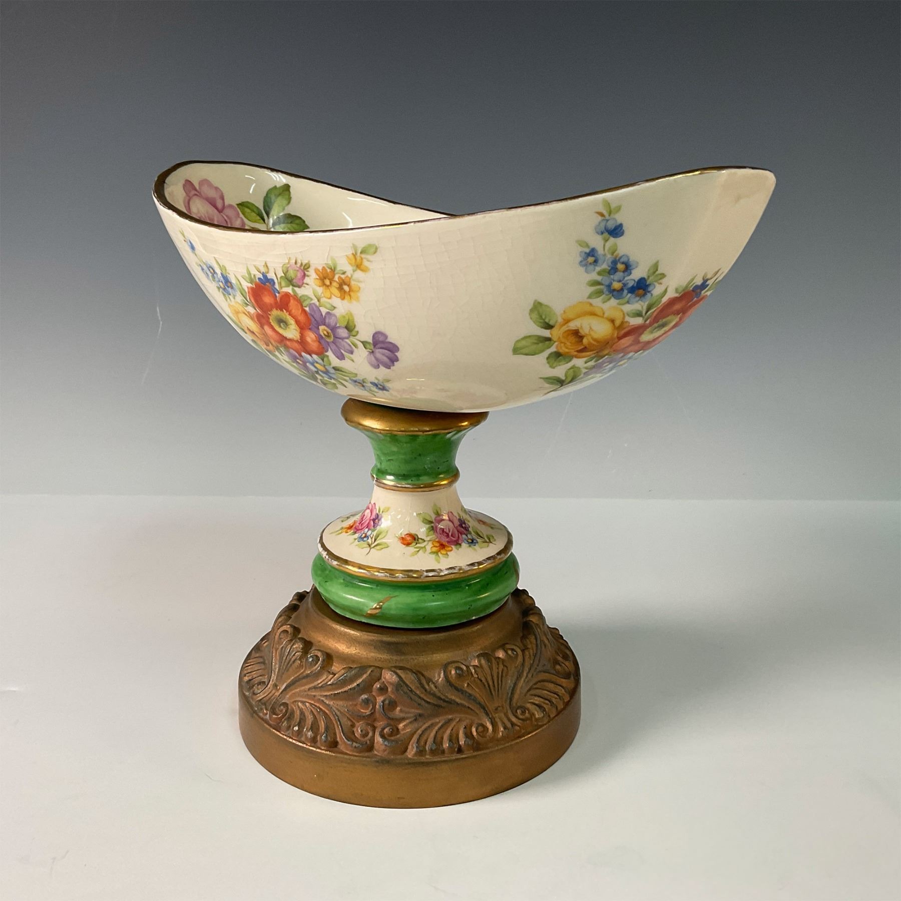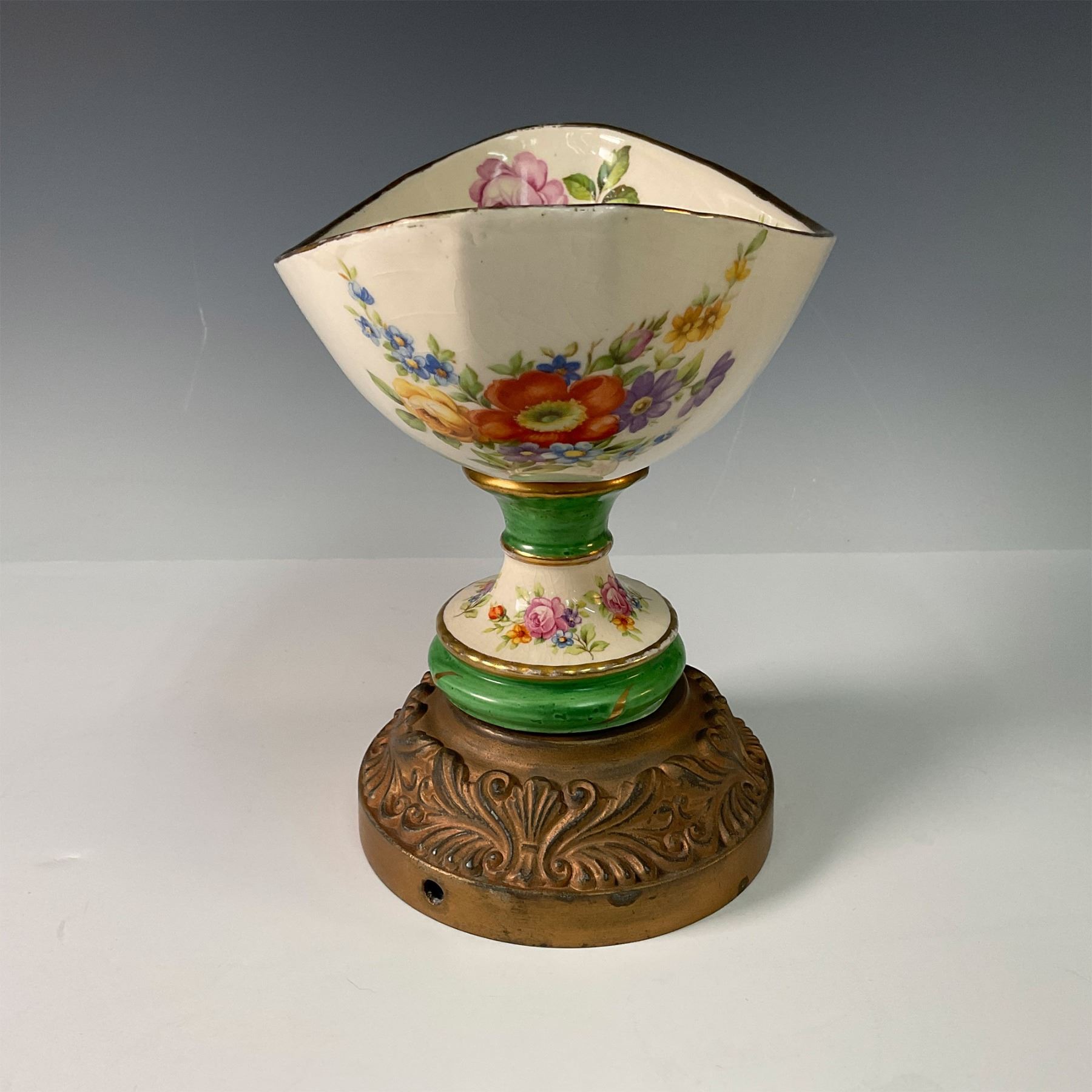 A decorative porcelain bowl featuring transfer images of maidens and floral motifs. The interior and exterior are adorned with vibrant flower transfers, accented by a gilt rim. The bowl is mounted on an ornate brass base with intricate detailing, adding a touch of sophistication. This piece combines classic elegance with functional artistry, ideal as a centerpiece or decorative accessory.
