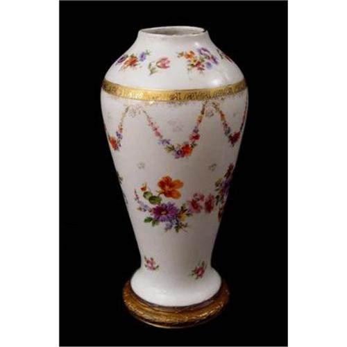 Antique porcelain lamp foot / base mounted on a bronze base. Porcelain is marked on the underside with a gold crown mark possibly that of German porcelain manufacturer Sitzendorf. In good used condition with minor signs of wear a shown. Please ask questions, request additional photos and shipping costs before buying.