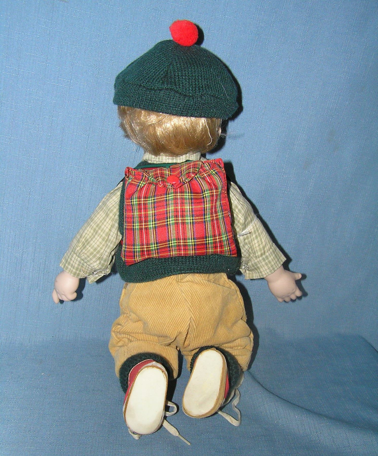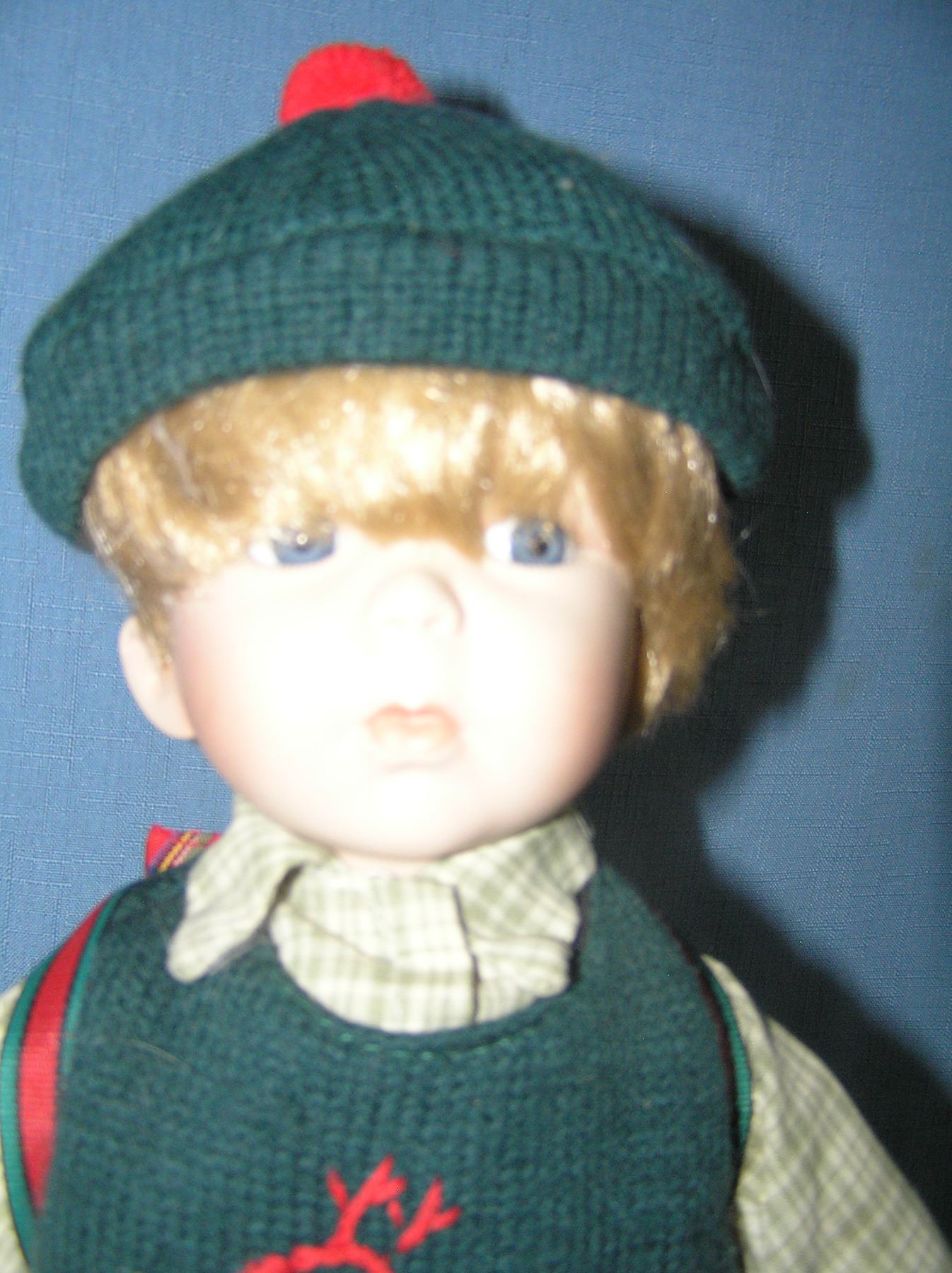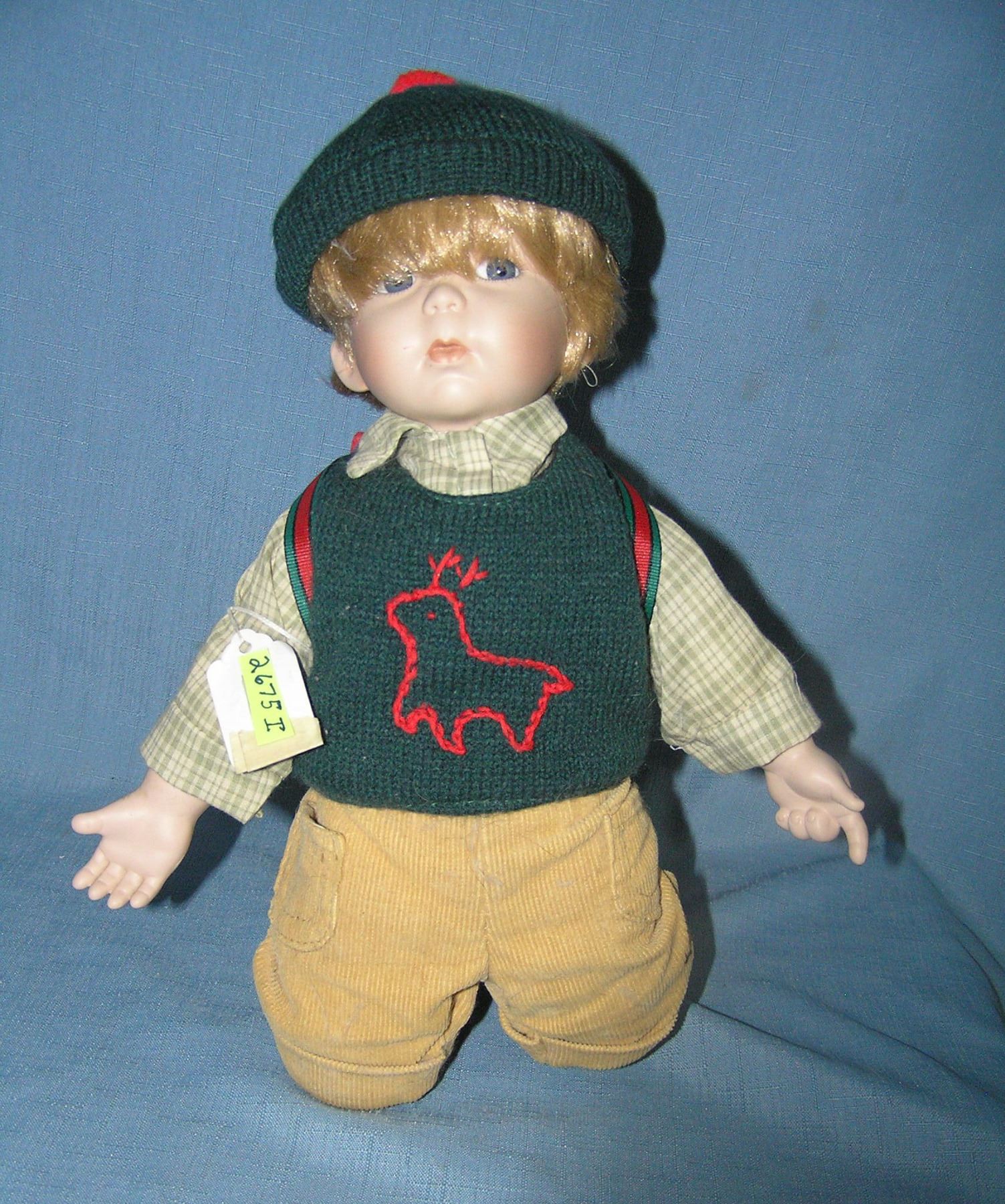 Porcelain boy doll with back pack and hat est. value $100.00-$125.00