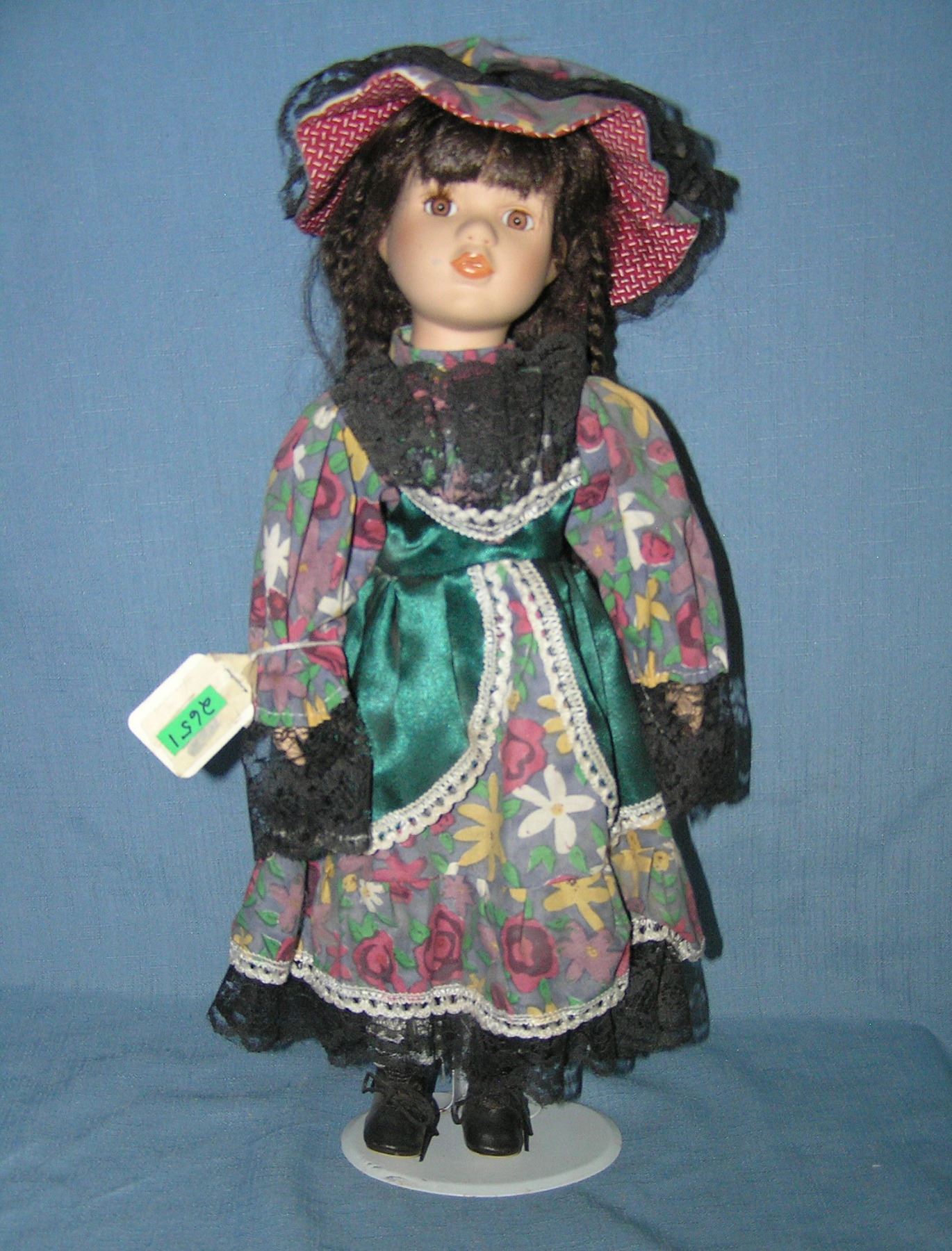 Porcelain doll with fancy dress and hat includes a doll stand est. value $75.00-$100.00