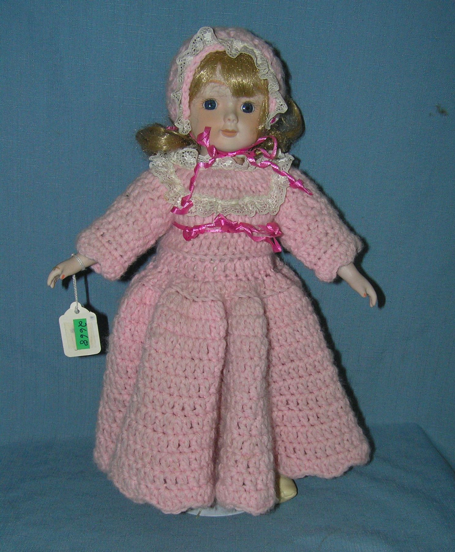 Porcelain doll with pink wool dress and hat and built in music box est. value $75.00-$100.00