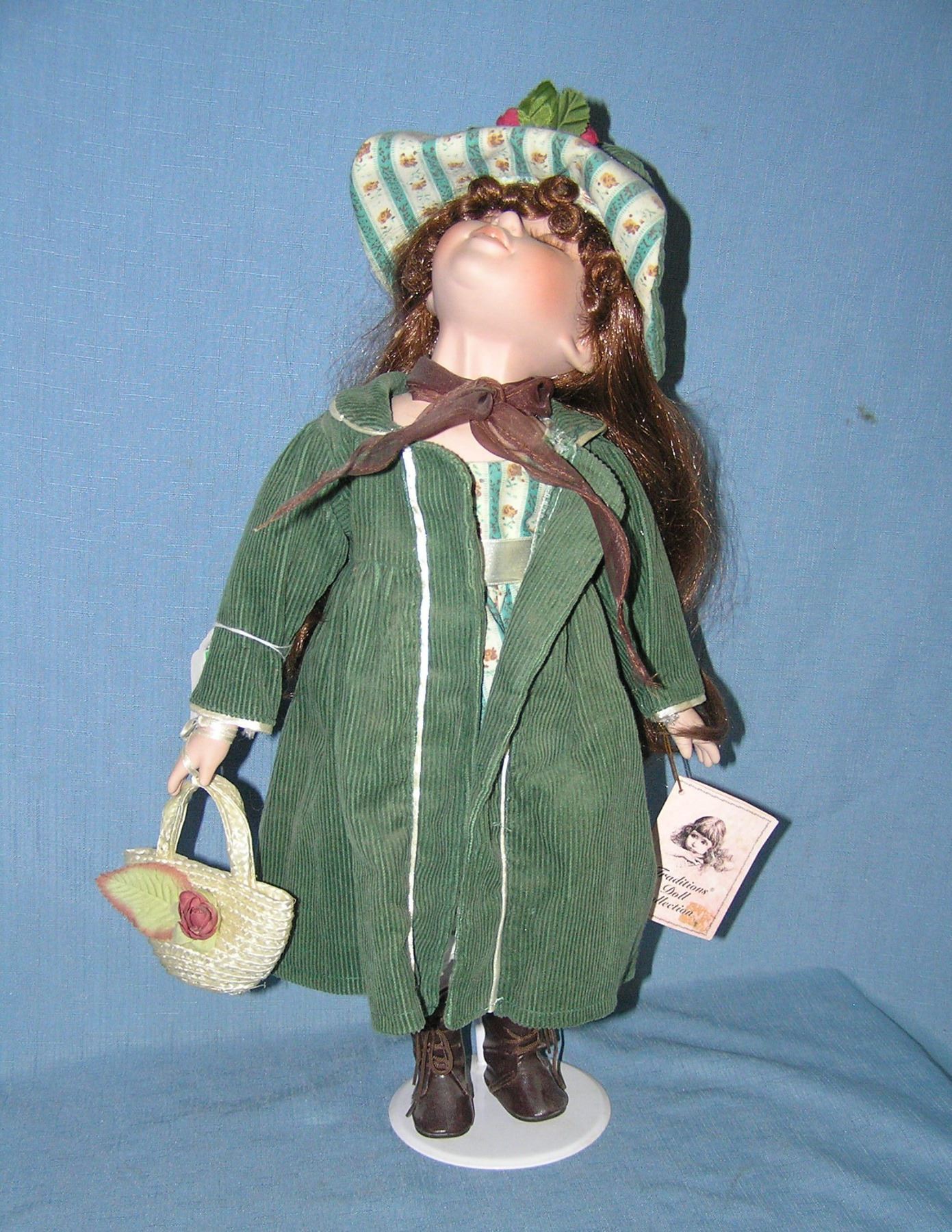 Porcelain doll with suede jacket and hat and decorative pocket book, original tag and stand est. value $75.00-$100.00