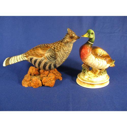 Porcelain duck, tiny chip, wooden blue grouse, crack