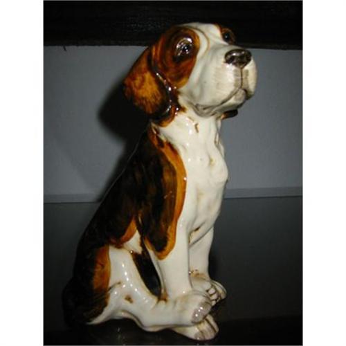 This gorgeous 7 inch dog is porcelain. The color is fantastic hand painted brown and white with magnificent details. The eyes are mesmorizing and looking straight at us. This dog is In wonderful condition vintage imperfection. No appearance of chip or breakage. It is 4.5 inch in diameter.