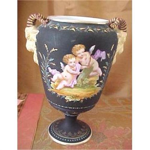 Lovely European pedestal style vase decorated with putti and formal leaf and dot decorations. The backround is matt black with turquoise and golden accents. The handles are golden ram heads with brown and gold striped antlers. There is a tight firing hairline inside which is very faint and does not go through to the outside of the vase. There is also some scuff marks on the back. Very slight gold wear on the ram heads consistant with usage. It is still a beauty.