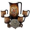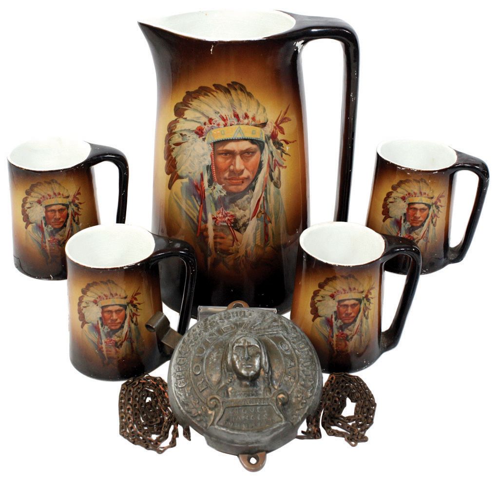 Porcelain tankard & 4 matching mugs w/Indians, marked A12 on bottoms, VG cond w/some paint loss 10" & 4"H & Round Oak Stoves Doe-Wah-Jack cast metal flue regulator w/pull chain, Exc cond, 5"Dia.
