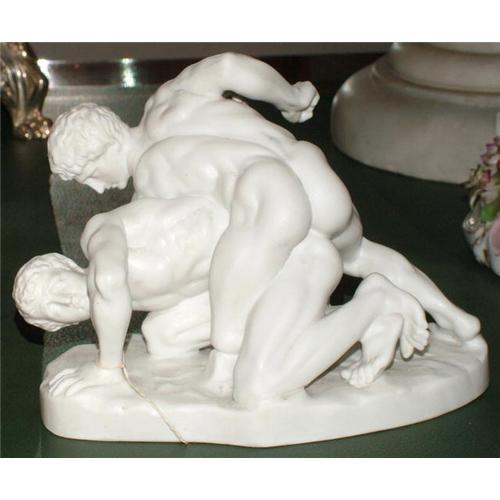 Figural Group titled: "the Wrestlers". The original dates from B.C. 350. The splendid group of the Wrestlers is considered to be the masterpiece of the Greek realistic school. The strain and muscular action of the two athletes is well displayed, The original is in the Uffizi Gallery in Florence. Bicuit porcelain , fine details in very good conditions, mesuring 7 incehs wide, 5.5 inches H and 4 inches D, it is not marked but is probably Austrian according to procedence.