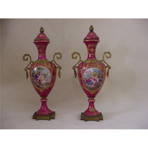 Pair of Bronze and Porcelain Urns, Made exclusively for Paris Decorations, made in France. Pair of urns 12" tall x 5 1/2" wide with hand painted decoration around a central transfer panel.