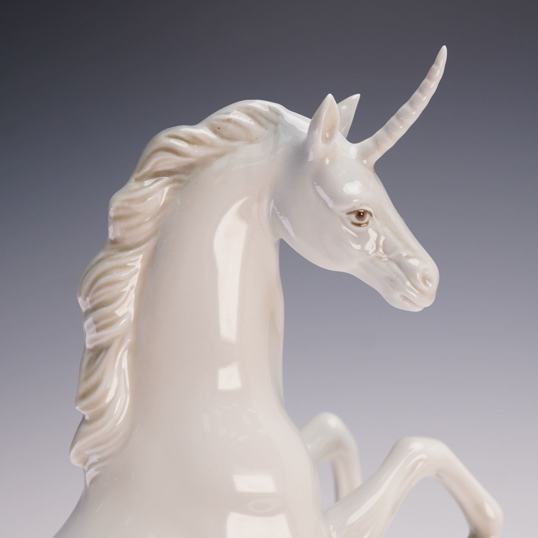 A striking porcelain unicorn figure by Porcelanas Miquel Requena, Cuart de Poblet, Valencia, Spain. The mythical creature is captured rearing on its hind legs, with flowing mane, raised forelegs, and spiraled horn. Finished in a glossy glaze with subtle pastel accents, the piece displays fine detail and artistry. Marked on the base with the Porcelanas Miquel Requena stamp.