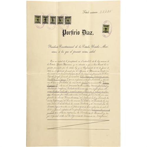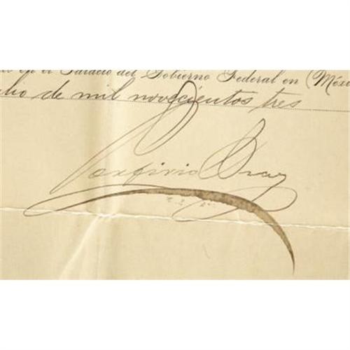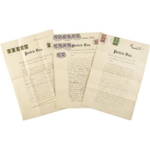 <B>Porfirio Diaz, Lot of Three Documents Signed.</B></I> Group of 3 partially printed DS "<I>Porfirio Diaz</B></I>", dated July 11, 1899; Dec. 10, 1895; and July 22, 1893. Each document is three pages, conjoined sheets and are mining -related in content. With partial separations at folds and accompanied by mining schematics. Overall condition is very good to near fine.<BR><BR><b>Shipping:</b> Flat Material, Small (<a target="_blank" href="http://www.heritageauctions.com/common/shipping.php">view shipping information</a>)