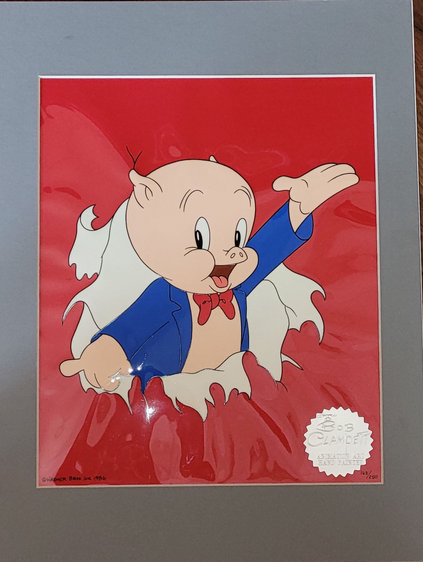 Original Bob Clampett hand-painted animation art cel featuring Porky Pig. The 1986 Warner Bros. licensed cel is numbered 163 of 250. It is matted and in wonderful condition. All items come with a COA and guarantee for the life of the piece.