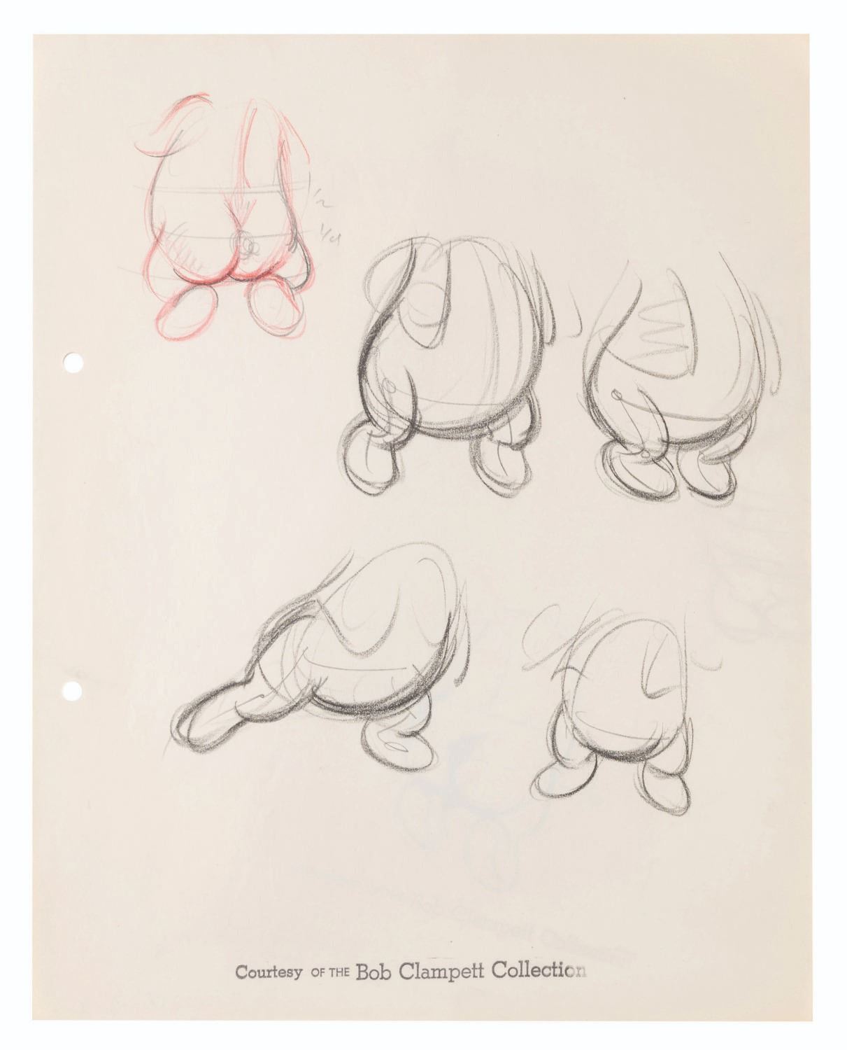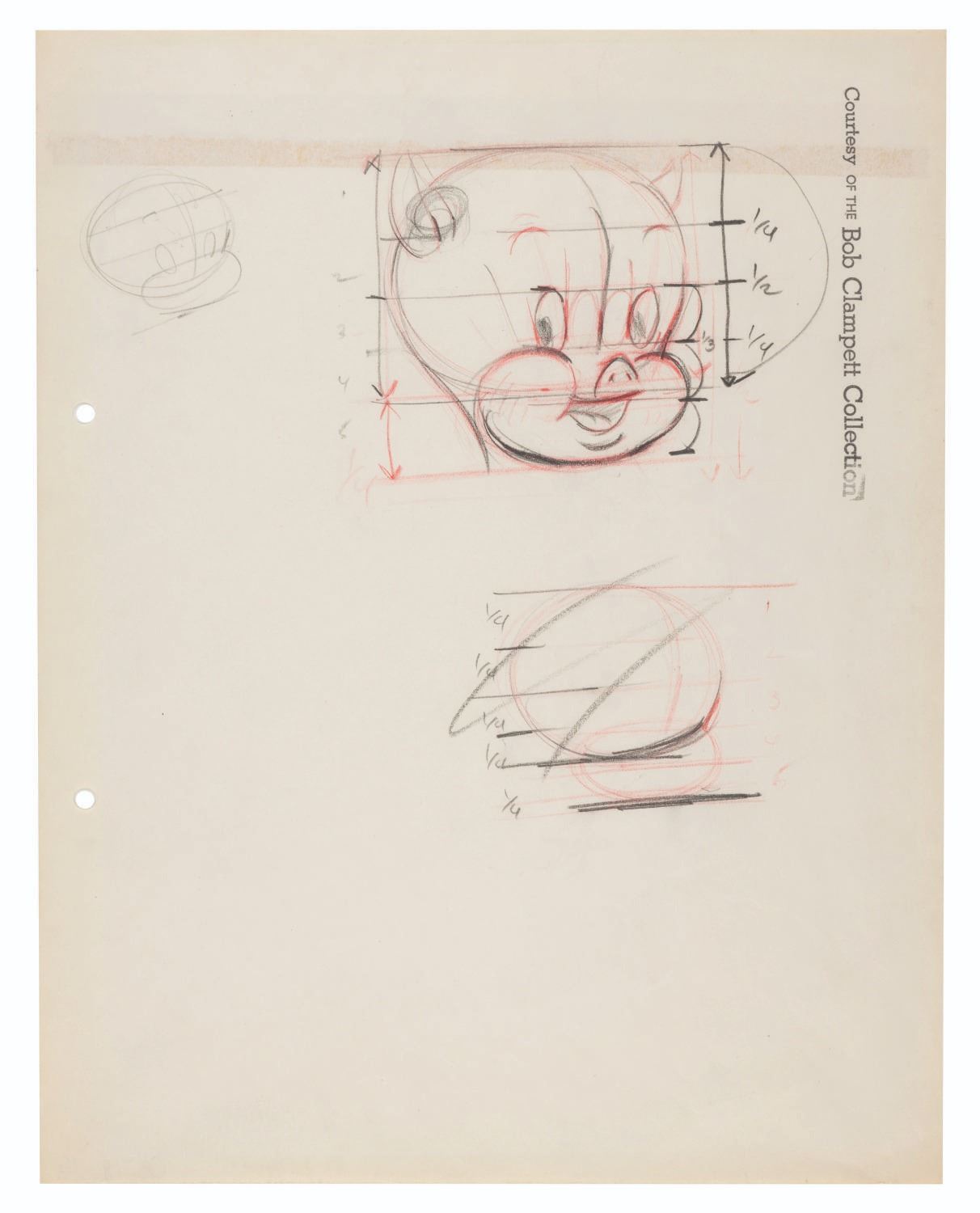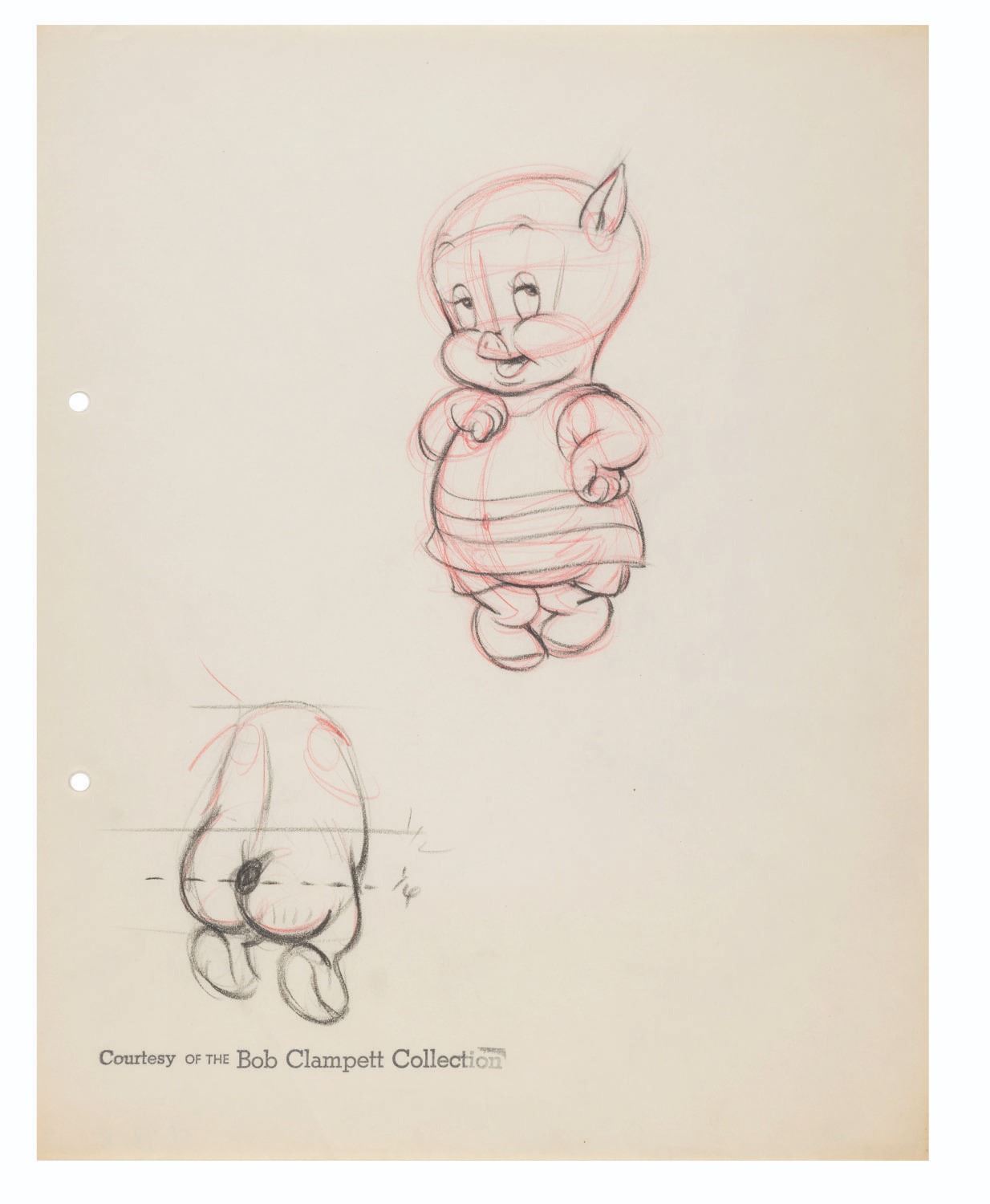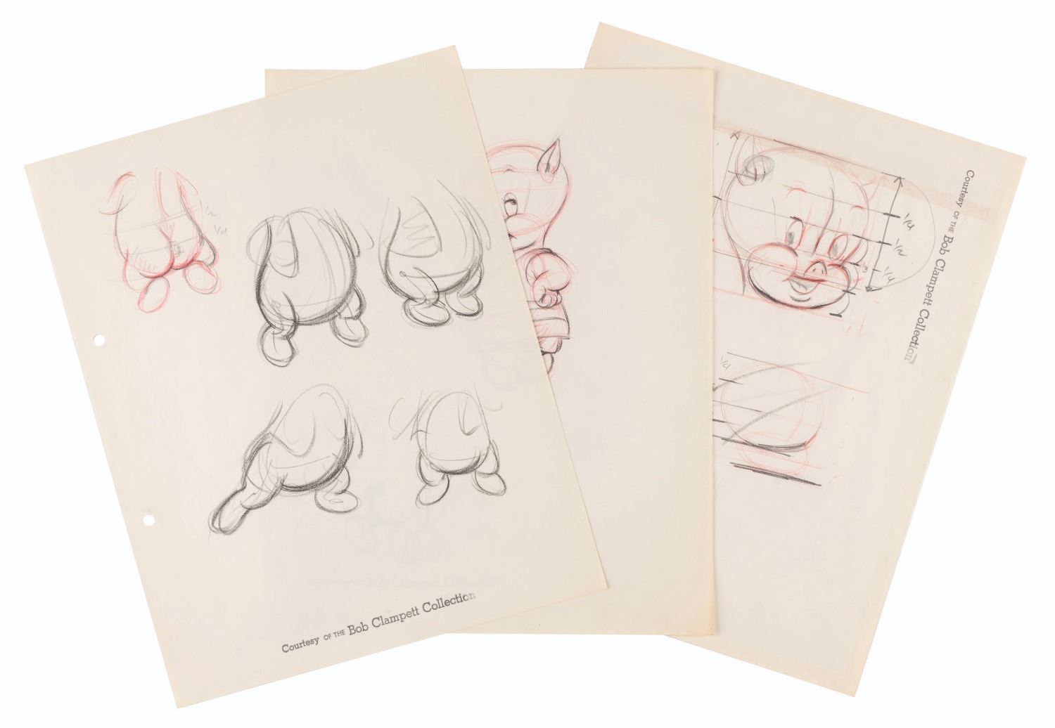 (Schlesinger, 1939) Bob Clampett’s redesign of Porky Pig on three sheets of drawings. The drawings focus on Porky’s redesigned face, torso, and rump. With image sizes ranging from 1.5” x 1.5” to 2.5” x 5.5” on 9.5” x 12” animation paper, the graphite and colored pencil drawings are in very good condition with light creases, wear, discoloration from age, and tape on the reverse from production use. Each drawing is stamped with “Courtesy of the Bob Clampett Collection.”